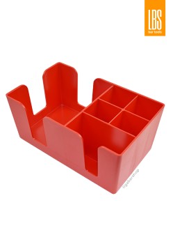 Барный органайзер LBS пластик красный. Барный аксессуар для хранения салфеток, сахара, размешивателей, зубочисток, трубочек и других дополнительных и вспомогательных аксессуаров. Универсальная подставка с шестью отделениями. Можно разместить все самое необходимое не только для бармена или бариста, но и для клиентов в плане самообслуживания в офисах у кофе машин. Компоновка наполнителей данной подставки органайзера может быть абсолютно любой на Ваше усмотрение исходя из потребностей. Выполнена из ударопрочного пластика.