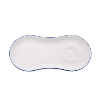 Блюдце Bonna Retro | Бонна Ретро 250x120 мм синий край (чашка 70299,69205). Bonna — профессиональный твердый фарфор. В коллекции Retro контрастные цветные линии, нарисованные вручную по краю, что делает ее идеальной для повседневного ужина, в то же время она достаточно изысканная, чтобы стать ярким акцентом. Фарфор Bonna отличается своей прочностью, устойчивостью к сколам и механическим воздействиям, что делает его идеальным для профессионального использования. Все изделия можно мыть в посудомоечной машине и использовать в СВЧ-печах.