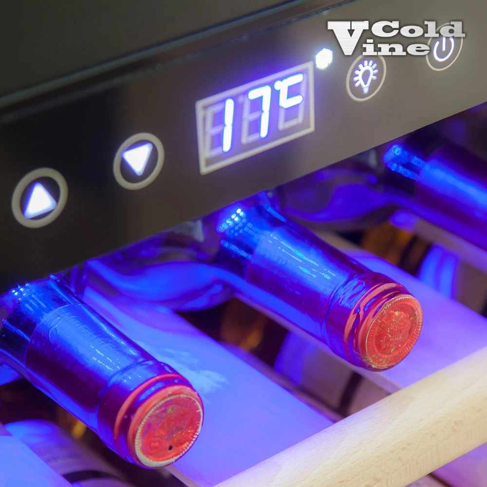 Винный шкаф ColdVine | Колд Вайн C18-KBB1. Линейку встраиваемых в нишу винных шкафов бренда Cold Vine с достоинством представляет однозонная модель C18-KBB1. Тонированное двойное стекло с защитой от ультрафиолета, широкая чёрная рама под стеклом, мягкая светодиодная подсветка и практически бесшумная работа - вот некоторые из качеств этого винного шкафа. Корпус винного холодильника изготовлен из стали, окрашенной в чёрный цвет. Дверь выполнена из тонированного стеклопакета с защитой от УФ-излучения, рама двери чёрная под стеклом. Стильный внешний вид винного шкафа дополняет стальная ручка. В сегменте встраиваемых винных шкафов Cold Vine есть аналогичная по вместительности и габаритам модель C18-KSB1, отличающаяся только стальной рамой двери. Внутри винного шкафа находится сенсорная панель управления, на которой можно включить винный холодильник, установить нужную Вам температуру для хранения необходимого сорта вин, а также включить мягкую светодиодную подстветку голубого цвета. На ЖК экране Вы всегда можете увидеть параметры настройки температуры, а также текущую температуру внутри винного шкафа. Вместимость винного холодильника составляет 18 бутылок вина типа Бордо емкостью 0,75 л. Также в холодильнике легко можно расположить бутылки с шампанским. Винный шкаф Cold Vine C18-KBB1 оснащён тремя деревянными нелакированными полками, две из которых легко выдвигаются на метабоксах. Каждая из полок вмещает по 6 стандартных бутылок вина типа Бордо емкостью 0,75 л. , а также бутылки с шампанскими винами. Винный шкаф Cold Vine C18-KBB1 предназначен исключительно для встройки в специальную мебельную нишу. Перед покупкой винного шкафа внимательно ознакомьтесь со схемой встраивания данного оборудования и заранее обеспечьте необходимые зазоры для встройки. При необходимости дверь винного шкафа может быть перенавешена на открывание справа налево (опция). Отдельно хотелось бы упомянуть о малошумности данной серии винных шкафов.