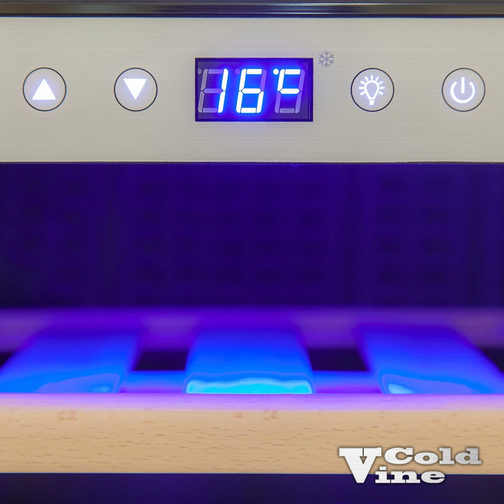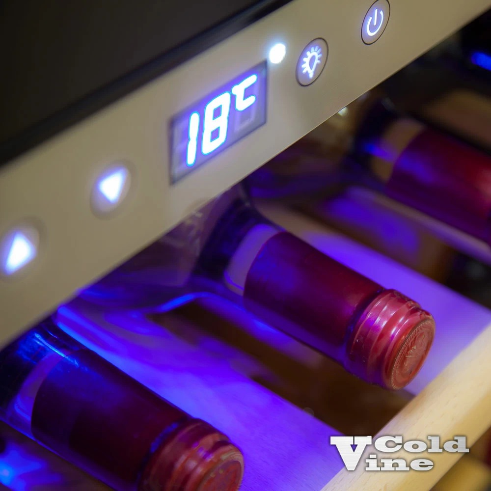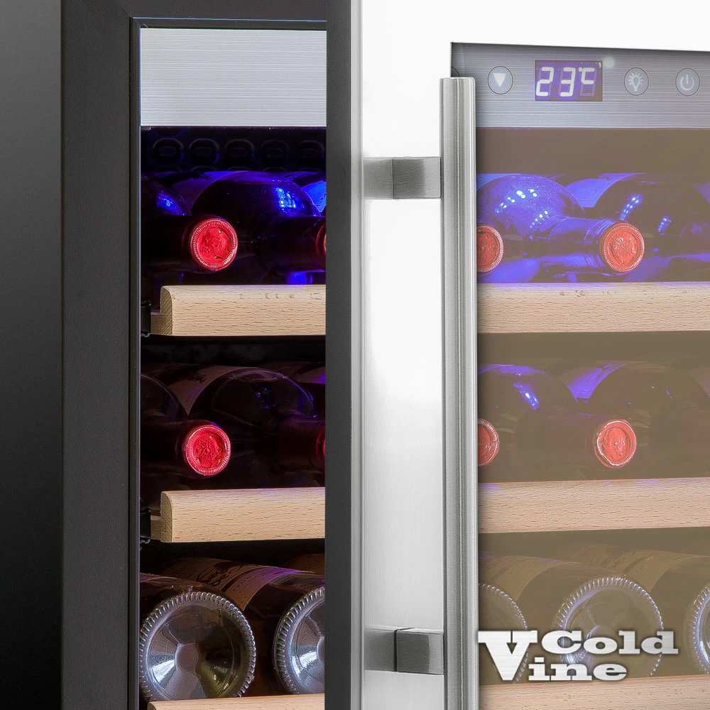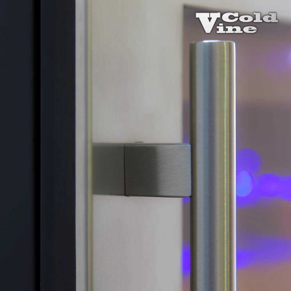 Винный шкаф ColdVine | Колд Вайн C18-KSB1. Линейку встраиваемых в нишу винных шкафов бренда Cold Vine с достоинством венчает однозонная модель C18-KSB1. Тонированное двойное стекло с защитой от ультрафиолета, стильная стальная рама под стеклом, мягкая светодиодная подсветка и практически бесшумная работа - вот некоторые из качеств этого винного шкафа, которые обязательно Вас привлекут. Корпус винного холодильника изготовлен из стали, окрашенной в чёрный цвет. Дверь выполнена из тонированного стеклопакета с защитой от УФ-излучения со стальной рамой по периметру. Стильный внешний вид винного шкафа дополняет изящная стальная ручка. В сегменте встраиваемых винных шкафов Cold Vine есть аналогичная по вместительности и габаритам модель C18-KBB1, отличающаяся только чёрной рамой двери. Внутри винного шкафа в тон стальной раме находится сенсорная панель управления серебристого цвета, на которой можно включить винный холодильник, установить нужную Вам температуру для хранения необходимого сорта вин, а также включить мягкую светодиодную подстветку голубого цвета. Температура внутри винного шкафа устанавливается в диапазоне от +5 до +20 ˚С, что позволяет хранить различные виды вин. На ЖК экране Вы всегда можете увидеть параметры настройки температуры, а также текущую температуру внутри винного шкафа. Вместимость винного холодильника составляет 18 бутылок вина типа Бордо емкостью 0,75 л. Также в холодильнике легко можно расположить бутылки с шампанским. Винный шкаф Cold Vine C18-KSB1 оснащён тремя деревянными нелакированными полками, две из которых легко выдвигаются на метабоксах. Каждая из полок вмещает на себе по 6 стандартных бутылок вина типа Бордо емкостью 0,75 л. , а также бутылки с шампанскими винами. Винный шкаф Cold Vine C18-KSB1 предназначен исключительно для встройки в специальную мебельную нишу. Перед покупкой винного шкафа внимательно ознакомьтесь со схемой встраивания данного оборудования и заранее обеспечьте необходимые зазоры для встройки. При необходимости дверь винного шкафа может быть перенавешена на открывание справа налево. Отдельно хотелось бы упомянуть о малошумности данной серии винных шкафов. Стильный и вместительный, винный шкаф Cold Vine C18-KSB1 будет служить Вам верным помощником и сохранит прохладными Ваши любимые напитки.