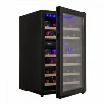 Винный шкаф ColdVine | Колд Вайн C34-KBF2  - это компактная и функциональная модель, обеспеченная всем необходимым для хранения вина в оптимальных условиях. Шкаф имеет 2 зоны охлаждения, в каждой из которых можно установить необходимую температуру для наилучших условий хранения и подготовки к подаче на стол вина. Модель комплектуется шестью деревянными полками без лакового покрытия. В винном холодильнике Cold Vine C34-KBF2 предусмотрена возможность перевешивания двери на другую сторону, что дает дополнительное удобство при установке холодильника в подходящее по габаритам место. Винный шкаф Cold Vine C34-KBF2 оснащен электронной панелью управления с цифровым дисплеем, температура в холодильной камере поддерживается с высокой точностью. Стекло дверцы защищено от воздействия вредных для вина ультрафиолетовых лучей. Для удобства потребителя модель снабжена индикатором температуры и светодиодной подсветкой. Винный холодильник предназначен для отдельностоящей установки и не предназначен для встраивания. Встраивать данную модель в мебельную нишу можно только с соблюдением значительных зазоров 127 мм с левой, правой, верхней и задней сторон.