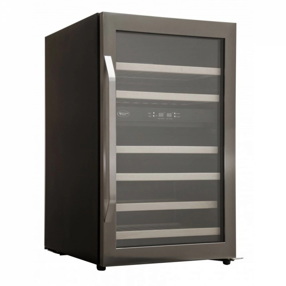 Винный шкаф ColdVine | Колд Вайн C34-KSF2 - это компактная и функциональная модель, обеспеченная всем необходимым для хранения вина в оптимальных условиях. Шкаф имеет 2 зоны охлаждения, в каждой из которых можно установить необходимую температуру для наилучших условий хранения и подготовки к подаче на стол вина. Модель комплектуется шестью деревянными полками без лакового покрытия. В винном холодильнике Cold Vine C34-KSF2 предусмотрена возможность перевешивания двери на другую сторону, что дает дополнительное удобство при установке холодильника в подходящее по габаритам место. Винный шкаф Cold Vine C34-KSF2 оснащен электронной панелью управления с цифровым дисплеем, температура в холодильной камере поддерживается с высокой точностью. Стекло дверцы защищено от воздействия вредных для вина ультрафиолетовых лучей. Для удобства потребителя модель снабжена индикатором температуры и светодиодной подсветкой. Винный холодильник C34-KSF2 предназначен для отдельностоящей установки и не предназначен для встраивания. Встраивать данную модель в мебельную нишу можно только с соблюдением значительных зазоров 127 мм с левой, правой, верхней и задней сторон.