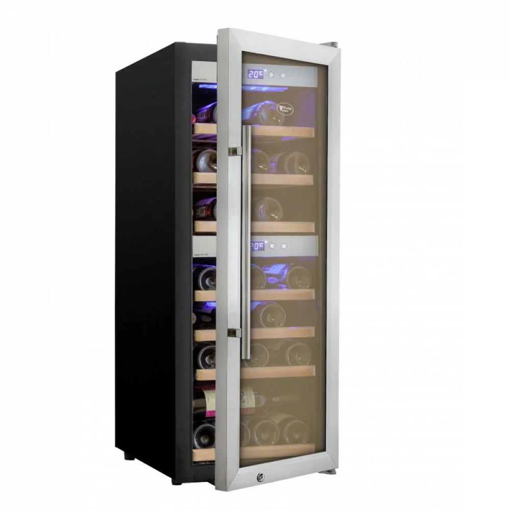 Винный шкаф ColdVine | Колд Вайн C38-KSF2 - стильный и функциональный винный шкаф с компрессорным охлаждением. Дверь винного шкафа изготовлена из двойного тонированного стекла с защитой от УФ-лучей. Рама двери полностью стальная, что придаёт винному шкафу неповторимый стиль. В комплекте к винному шкафу идёт стальная ручка, в тон раме. А также на двери есть встроенный замок, благодаря чему Ваша винная коллекция всегда будет под надёжной защитой. В линейке винных шкафов Cold Vine есть аналогичная по вместительности и габаритам модель C38-KBF2, отличающаяся от собрата чёрной рамой двери с тонкой стальной окантовкой по периметру. Внутреннее пространство винного шкафа разделено на две независимые температурные зоны. В каждой из них можно установить температуру от +5 до +20 ˚С и хранить как красное, так и белое вино. Производителем рекомендуется устанавливать в верхней зоне температуру от +5 до 16˚С (идеально для белых и шампанских вин), а в нижней от +9 до +20 ˚С (подходит для хранения красных вин). При этом нельзя устанавливать температуру в верхней зоне выше, чем в нижней, разница должна быть в 4 градуса. В каждой температурной зоне есть своя отдельная сенсорная панель управления, на которой можно включить винный холодильник, установить нужную Вам температуру для хранения необходимого сорта вин, а также включить мягкую светодиодную подсветку голубого или белого цвета. Вместимость винного холодильника составляет 38 бутылок вина типа Бордо емкостью 0,75 л. Всего в винном шкафе 7 деревянных нелакированных полок, 6 из которых можно легко выдвигать не метабоксах. В винном холодильнике C38-KSF2 можно также расположить бутылки с шампанским, при этом общая вместимость винного шкафа может незначительно сократится. Выдвижные полки вмещают на себе по 5 стандартных бутылок вина типа Бордо емкостью 0,75 л. На нижней полке бутылки укладываются одна на другую в два ряда. Компрессорный винный шкаф Cold Vine C38-KSF2 является отдельностоящим и не предусматривает встройки в мебель, но при необходимости его можно устанавливать в нишу, соблюдая при этом необходимые для охлаждения стенок шкафа зазоры в 3-5 см.