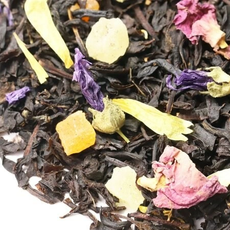 Держит интригу и смесь из почти черных чайных листочков, желто-оранжевых фруктов, розовых, фиолетовых и горящих желтых лепестков. Терпкость вкуса черного чая оттеняется сладостью папайи и ананаса, вобравших в себя силу южного солнца. Роскошный янтарный цвет и покоряющий запах гарантируют, что чайная церемония пройдет успешно, в дружелюбной обстановке за располагающей беседой. Состав: Чай черный, кусочки ананаса, лепестки розы, лепестки календулы, цветы мальвы, аромат красного персика.