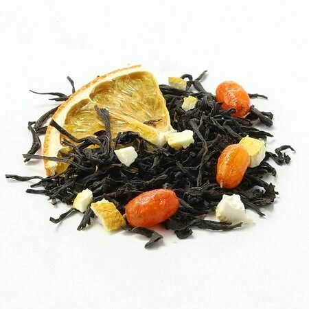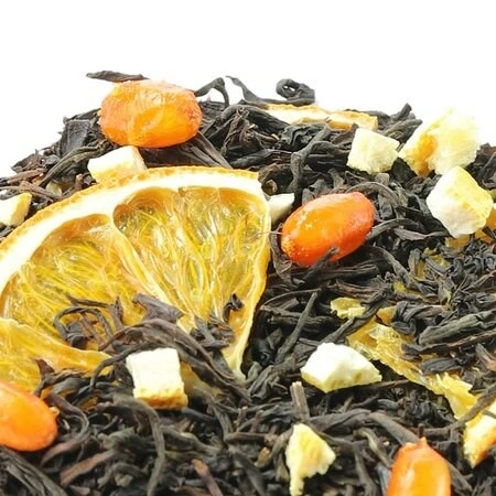 Состав: Чай черный, сегменты апельсина, ягоды облепихи, кусочки апельсина с цедрой, аромат "Сочный цитрус".