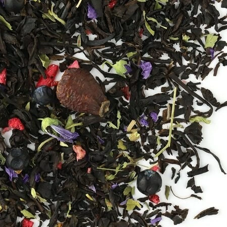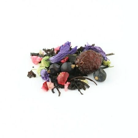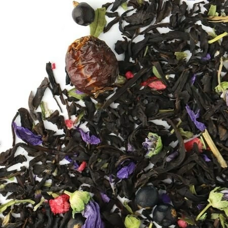 Состав: Чай черный, плоды можжевельника, плоды шиповника, чабрец, мята, цветы мальвы, кусочки клюквы, аромат бергамота и смородины.
