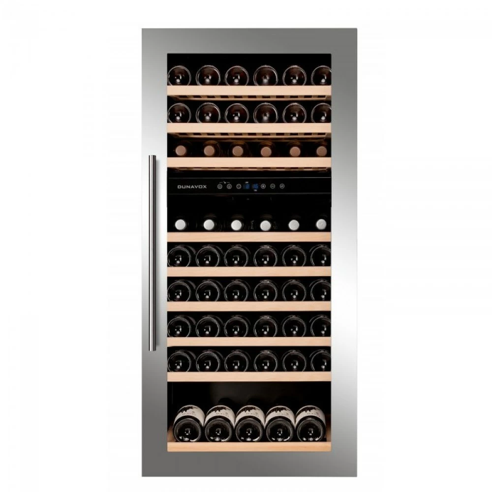 Винный шкаф Dunavox | Дунавокс Build-IN DAB-89.215DSS. Холодильник для вина нового поколения. Очень вместительная, встраиваемая в нишу модель с двумя температурными зонами и минимальным потреблением электроэнергии. Комплектуется девятью деревянными полками, имеется возможность заказать дополнительную полку для демонстрации бутылок. Шкаф оснащен сенсорной панелью управления, с помощью которой пользователь выбирает необходимый температурный режим работы аппарата. В модель DAB-89.215DSS встроены такие функции как: функция звукового оповещения об открытой двери и энергосберегающая функция "Отдых", позволяющая при работающем холодильнике (работающем охлаждении вина) на время отключить дисплей, подсветку и звуковые оповещения. Корпус модели DAB-89.215DSS металлический с покрытием черного цвета, дверца выполнена из прозрачного двойного стеклопакета в рамке из нержавеющей стали. Ручка двери удобная, накладная. Цифровой индикатор температуры и внутреннее освещение выполнены на светодиодах синего цвета. Винный шкаф Dunavox DAB-89.215DSS предназначен для встраивания в нишу. Для обеспечения охлаждения компрессора и отвода горячего воздуха необходимо предусмотреть сквозную вентиляционную нишу площадью не менее 200 см² от цоколя до верхней части мебельного модуля. Рекомендуется устанавливать винный шкаф Dunavox DAB-89.215DSS вдали от прямых солнечных лучей и источников тепла (духовки, нагревателя, батареи и т.д.). Прямой солнечный свет может плохо повлиять на корпус, а источники тепла могут увеличить энергопотребление. Не допускается установка аппарата рядом с плитой или прибором, который может нагревать воздух в пространстве 1-5 см от его корпуса (например, рядом с холодильником, у которого теплообменная стенка граничит с аппаратом). Не рекомендуется устанавливать прибор на полы с подогревом без специальной термоизолирующей подложки.