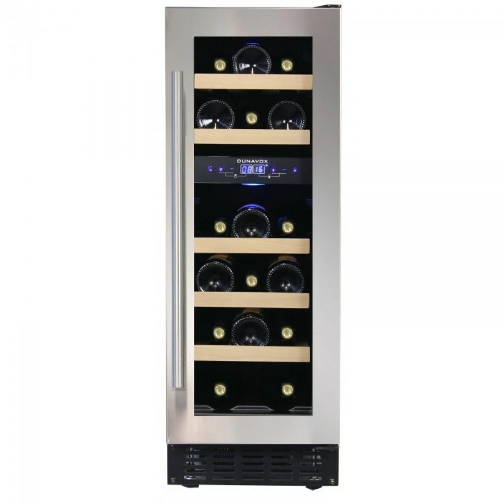 Винный шкаф Dunavox | Дунавокс EXCLUSIVE DAU-17.57DSS. Шкаф для хранения вина имеет систему циркуляции воздуха, комплектуется пятью деревянными полками, характеризуется минимальным уровнем энергопотребления. Модель двухзональная, причем максимальная разница температур между зонами шкафа не должна превышать 8°С. Шкаф оснащен сенсорной панелью управления, с помощью которой пользователь выбирает необходимый температурный режим работы аппарата. В модель DAU-17.57DSS встроены такие функции как: функция звукового оповещения об открытой двери, энергосберегающая функция "Отдых", позволяющая при работающем холодильнике (работающем охлаждении вина) на время отключить дисплей, подсветку и звуковые оповещения и функция увеличения влажности воздуха для создания оптимальных условий для хранения и дозревания вина. Дизайн винного холодильника DAU-17.57DSS выполнен в привлекательном лаконичном стиле. Корпус из металла с покрытием черного цвета, дверца выполнена из тонированного стекла в бесшовной стальной раме. Ручка шкафа удобная, накладная, выполнена из нержавеющей стали. Цифровой индикатор температуры и внутреннее освещение - на светодиодах синего цвета. Винный шкаф Dunavox DAU-17.57DSS c легкостью встраивается под столешницу, может устанавливаться в нишу или использоваться как отдельностоящий. Охлаждение компрессора происходит через вентиляционные решетки внизу шкафа, что позволяет встраивать винный холодильник без зазоров. Рекомендуется устанавливать винный шкаф Dunavox DAU-17.57DSS вдали от прямых солнечных лучей и источников тепла (духовки, нагревателя, батареи и т.д.). Прямой солнечный свет может плохо повлиять на корпус, а источники тепла могут увеличить энергопотребление. Не рекомендуется устанавливать прибор на полы с подогревом без специальной термоизолирующей подложки. Слишком низкая температура окружающей среды также может быть причиной неправильной работы изделия.
