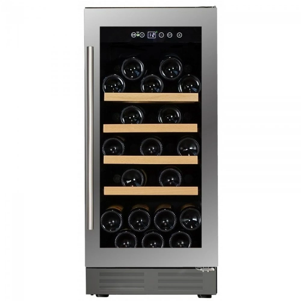 Винный шкаф Dunavox | Дунавокс EXCLUSIVE DAU-32.81SS. Монотемпературный винный шкаф оснащен системой циркуляции воздуха для его равномерного доступа ко всем полкам шкафа и угольным фильтром. Комплектуется холодильник DAU-32.81SS пятью деревянными полками. В нем предусмотрена возможность перевешивания двери на другую сторону, что дает дополнительное удобство при установке холодильника в подходящее по габаритам место. Шкаф оснащен электронной панелью управления, с помощью которой пользователь выбирает необходимый температурный режим работы аппарата. В модель DAU-32.81SS встроены такие функции как: функция звукового оповещения об открытой двери, энергосберегающая функция "Отдых", позволяющая при работающем холодильнике (работающем охлаждении вина) на время отключить дисплей, подсветку и звуковые оповещения и функция увеличения влажности воздуха для создания оптимальных условий для хранения и дозревания вина. Элегантный внешний вид винного холодильника DAU-32.81SS подойдет как к интерьеру современной кухни, так и обстановке небольшого ресторана. Корпус из металла с покрытием черного цвета, дверца выполнена из тонированного стекла, защищенного от воздействия ультрафиолетовых лучей. Ручка шкафа удобная, накладная, выполнена из нержавеющей стали, рама двери - стальная. Цифровой индикатор температуры и внутреннее освещение - на светодиодах синего цвета.