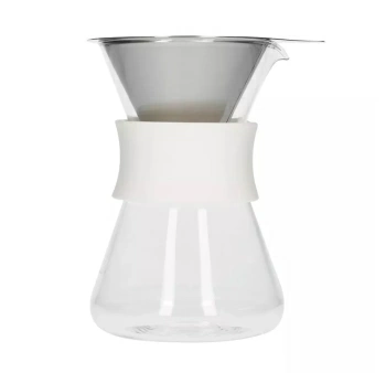 Декантер Hario | Харио Simply 400 мл c воронкой белый. Стеклянная кофеварка Hario Simply представляет собой комбинацию воронки и декантера. Воронка-фильтр изготовлена из металла и не требует дополнительных бумажных фильтров, емкость стеклянного кувшина составляет 400 мл, достаточно для 1-2 порций кофе. Специальные двойные стенки удерживают кофейную гущу внутри, в то время как снаружи фильтра собираются кофейные масла и придают вашему напитку насыщенный вкус. Графин изготовлен из стекла, а съемная силиконовая лента обеспечивает надежный захват. Все элементы устройства легко разбираются, что облегчает очистку.