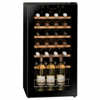 Винный шкаф Dunavox | Дунавокс Home DX-28.88KF. Модель укомплектована шестью полками из натурального дерева и одной металлической демонстрационной решеткой для вертикальной установки бутылок. Шкаф имеет одну зону охлаждения. В верхней части есть сенсорная панель, с помощью которой пользователь выбирает необходимый температурный режим работы аппарата. На ней расположены сенсорные кнопки для регулировки температуры и включения освещения. Данные термостата демонстрирует цифровой экран с подсветкой. Дверца шкафа с тонированным стеклом c защитой от ультрафиолетовых лучей и встроенной ручкой, открывается на 100 градусов. Специальная система поддержания влажности и компрессорная система охлаждения обеспечит в Вашем винном шкафе идеальные условия для хранения любых видов вин. Винный шкаф может использоваться как отдельностоящий, так и встроенный, с соблюдением необходимых для охлаждения зазоров 2-5 см, т.к. охлаждение винного шкафа осуществляется через нагрев боковых стенок. А также под винным шкафом желательно сделать воздухозаборную решетку с выводом воздуха за винный шкаф.Это позволит охладить компрессор. При открытии двери она выходит за корпус шкафа на 1,5 см.