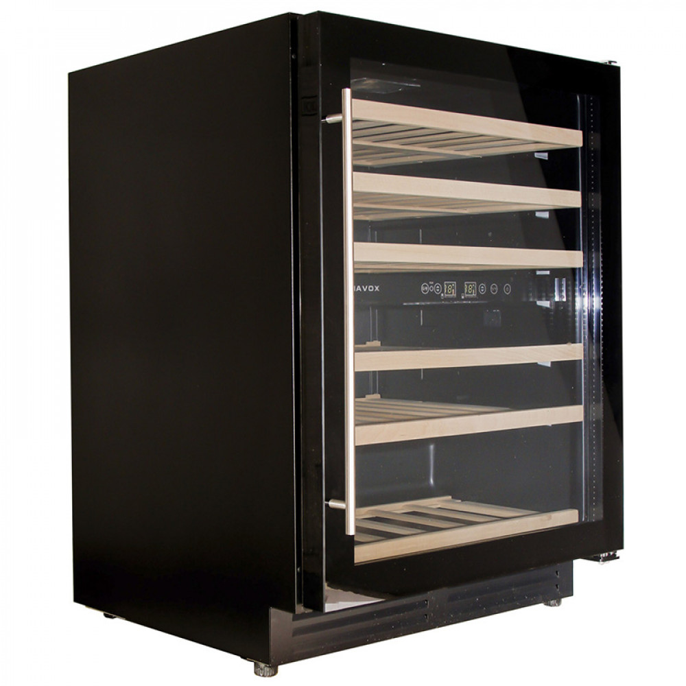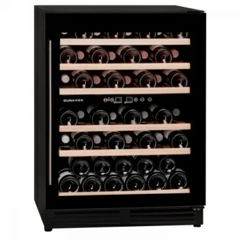 Винный шкаф Dunavox | Дунавокс EXCLUSIVE DX-51.150DBK/DP - двухзонная компрессорная модель, произведенная по новейшим технологиям для наших самых требовательных клиентов. Винный шкаф DX-51.150DBK/DP из специальной серии винных холодильников для встройки под столешницу. Модель имеет две зоны охлаждения, максимальная разница температур между которыми не должна превышать 8°С. Шкаф оснащен новым, мощным компрессором, с пониженным энергопотреблением и шумом, внутренними вентиляторами в каждой зоне для равномерного доступа холодного воздуха ко всем полкам шкафа, угольным фильтром и нагревательным элементом. Комплектуется холодильник DX-51.150DBK/DP шестью деревянными полками и съемной вентиляционной решеткой. В нем предусмотрена возможность перевешивания двери на другую сторону, что дает дополнительное удобство при установке холодильника в подходящее по габаритам место. Презентабельный внешний вид винного холодильника DX-51.150DBK/DP подойдет как к интерьеру современной кухни, так и обстановке небольшого ресторана. Корпус из металла с покрытием черного цвета, дверца выполнена из тонированного стекла, защищенного от воздействия ультрафиолетовых лучей. Ручка шкафа удобная, накладная, выполнена из нержавеющей стали. Цифровой индикатор температуры и внутреннее освещение - на светодиодах синего цвета. Винный шкаф Dunavox DX-51.150DBK/DP легко встраивается под столешницу или может устанавливаться отдельно. Охлаждение компрессора происходит через вентиляционные решетки внизу шкафа, что позволяет встраивать винный холодильник без зазоров. Модель DX-51.150DBK/DP имеет углубленный плинтус 105мм, который дает возможность снять вентиляционную решетку, идущую в комплекте со шкафом, и установить свою, подходящую под цвет интерьера. Рекомендуется устанавливать винный шкаф Dunavox DX-51.150DBK/DP вдали от прямых солнечных лучей и источников тепла (духовки, нагревателя, батареи и т.д.). Прямой солнечный свет может плохо повлиять на корпус, а источники тепла могут увеличить энергопотребление. Не допускается установка аппарата рядом с плитой или прибором, который может нагревать воздух в пространстве 1-5 см от его корпуса (например, рядом схолодильником, у которого теплообменная стенка граничит с аппаратом). Не рекомендуется устанавливать прибор на полы с подогревом без специальной термоизолирующей подложки.