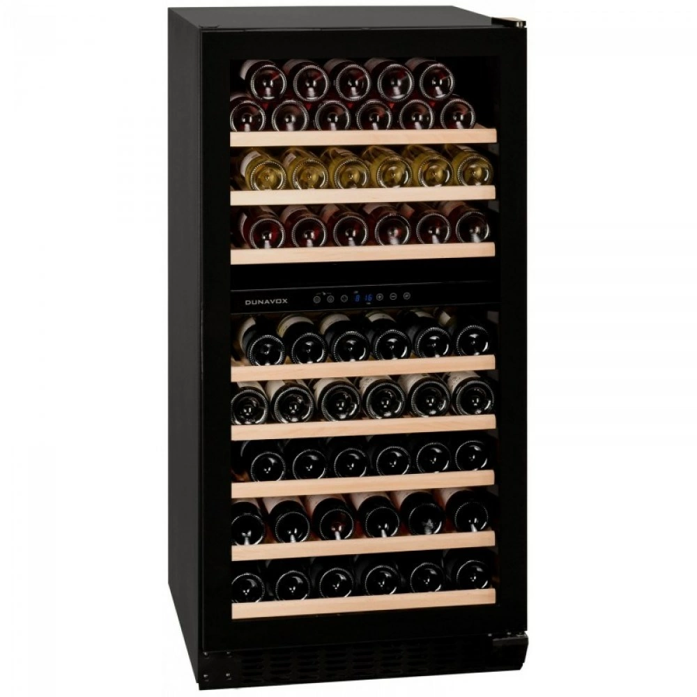 Винный шкаф Dunavox | Дунавокс EXCLUSIVE DX-94.270DBK. Модель имеет две зоны охлаждения, максимальная разница температур между которыми не должна превышать 8°С. Шкаф оснащен внутренними вентиляторами в каждой зоне для равномерного доступа холодного воздуха ко всем полкам шкафа, угольным фильтром, нагревательным элементом и замком. Комплектуется холодильник DX-94.270DBK восемью деревянными полками. В нем предусмотрена возможность перевешивания двери на другую сторону, что дает дополнительное удобство при установке холодильника в подходящее по габаритам место. Корпус холодильника выполнен из металла с покрытием черного цвета, дверца стеклянная в бесшовной стальной раме с удобной, утопленной ручкой. Цифровой индикатор температуры и внутреннее освещение - на светодиодах синего цвета. Компрессорный винный шкаф DX-94.270DBK может быть встроен под столешницу и в нишу с соблюдением необходимых для охлаждения зазоров 2-5 см или использоваться как отдельностоящий. Охлаждение системы компрессора организовано через вентиляционные решетки внизу шкафа. Рекомендуется устанавливать винный шкаф Dunavox DX-94.270DBK вдали от прямых солнечных лучей и источников тепла (духовки, нагревателя, батареи и т.д.). Прямой солнечный свет может плохо повлиять на корпус, а источники тепла могут увеличить энергопотребление. Не допускается установка аппарата рядом с плитой или прибором, который может нагревать воздух в пространстве 1-5 см от его корпуса (например, рядом схолодильником, у которого теплообменная стенка граничит с аппаратом). Не рекомендуется устанавливать прибор на полы с подогревом без специальной термоизолирующей подложки.