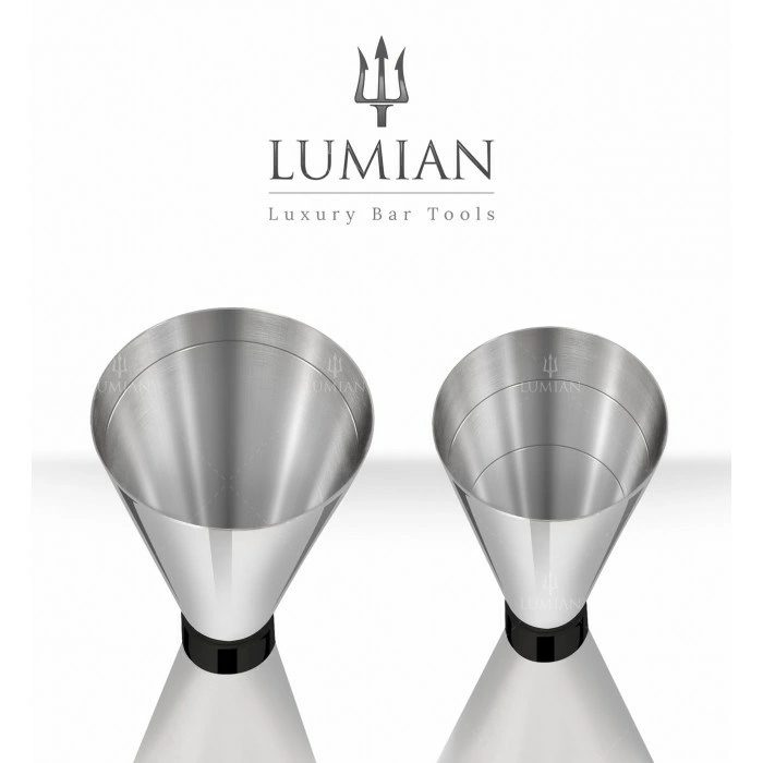 Джиггер Люмина Мистер Слим 30/60 мл черный рубин - профессиональный джиггер от итальянского бренда Lumian. Объёмы 30 и 60 мл. Внутри 3 метки: 20, 10 и 45 мл. Lumian Mr Slim идеально сочетает в себе точность и элегантность. Два конуса соединены кольцом рубинового цвета. Благодаря новой системе электросварки по периметру он стал еще более прочным и сбалансированным.