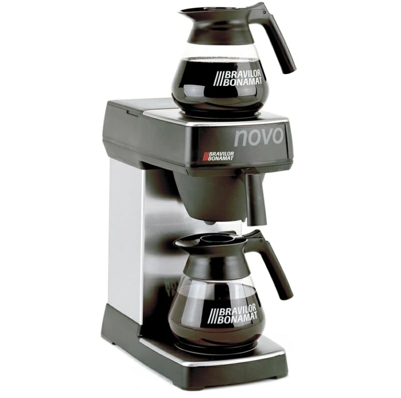 Фильтр кофемашина Bravilor Bonamat | Бравилор Бонамат Novo. Капельная кофеварка без подключения к водопроводу используется на предприятиях общественного питания и торговли для приготовления кофе (американо). Модель с одним заварочным устройством и двумя саморегулируемыми подогревателями. Кофемашина может быть вручную заполнена водой и, следовательно, размещена в любом месте. Саморегулируемые подогреватели обеспечивают сохранение оптимальной температуры кофе. Скорость приготовления - 1 кувшин/5 минут. В комплект входят один стеклянный кувшин и пластиковый держатель под фильтры.