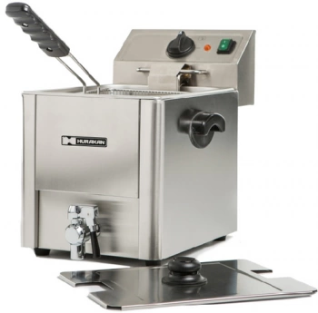 Фритюрница Hurakan | Хуракан HKN-FT8N предназначена для приготовления разнообразных продуктов в большом объеме масла или жира. Используется на предприятиях общественного питания и торговли. Корпус выполнен из нержавеющей стали. Особенности: электромеханическая система управления, регулировка температуры, холодная зона, кран для слива масла. В комплектацию входят: корзина и крышка, размер корзины без ручки 240х140х190мм.