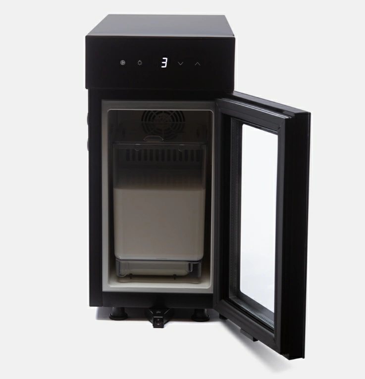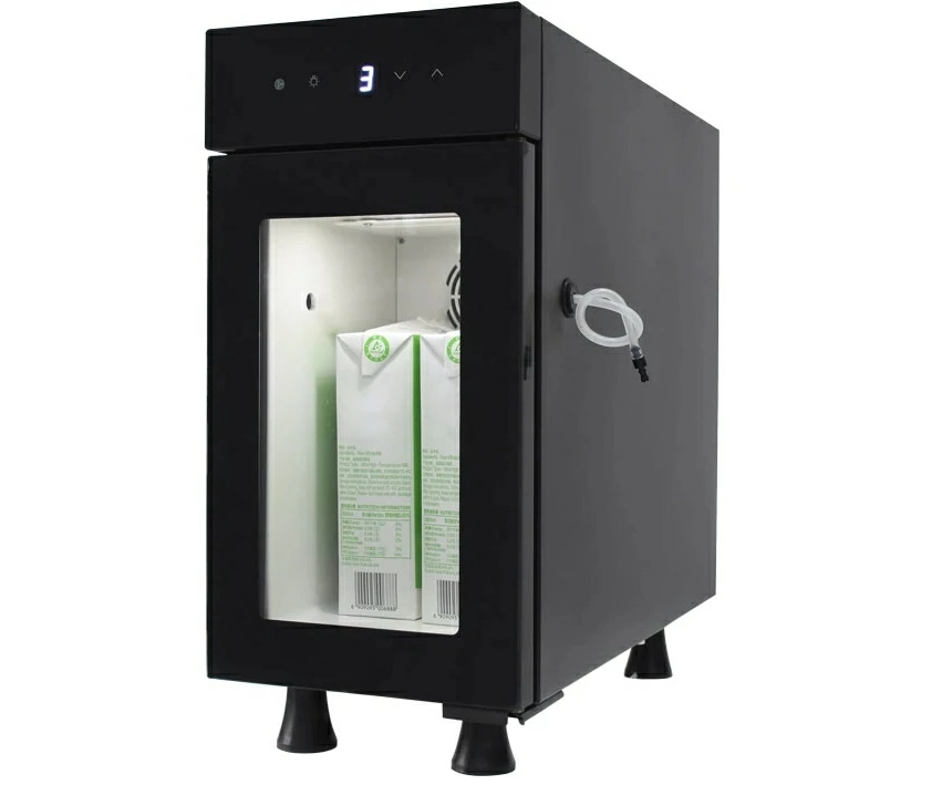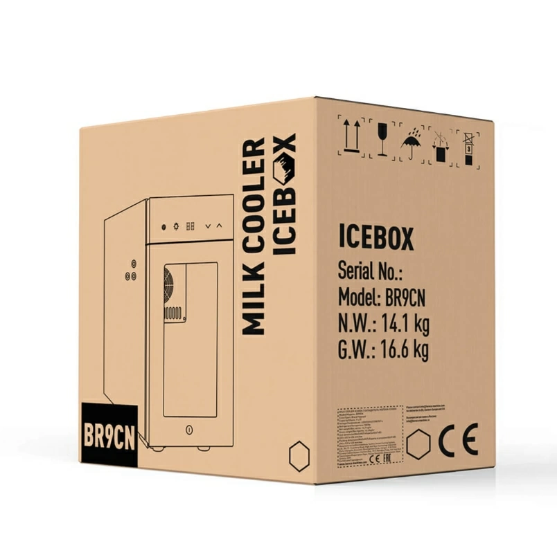 Холодильник ICEBOX BR9CN. Компактный и лаконичный компрессорный холодильник с прозрачной дверцей (без датчика количества молока), разработанный специально для работы с кофемашинами для сохранения свежести молока и приготовления вкусных кофейно-молочных напитков. Совместим с большинством моделей профессиональных суперавтоматических кофемашин. Подходит для установки в точках самообслуживания. Цифровой регулятор температуры с сенсорным экраном и дисплеем. Отверстия с двух сторон корпуса для молочной трубки, подсоединяемой к кофемашине (совместимые диаметры через входящие в комплектацию переходники 7 мм / 10 мм / 13 мм). Съемный контейнер для молока MILKBOX объемом 4.5 литра входит в базовую комплектацию.