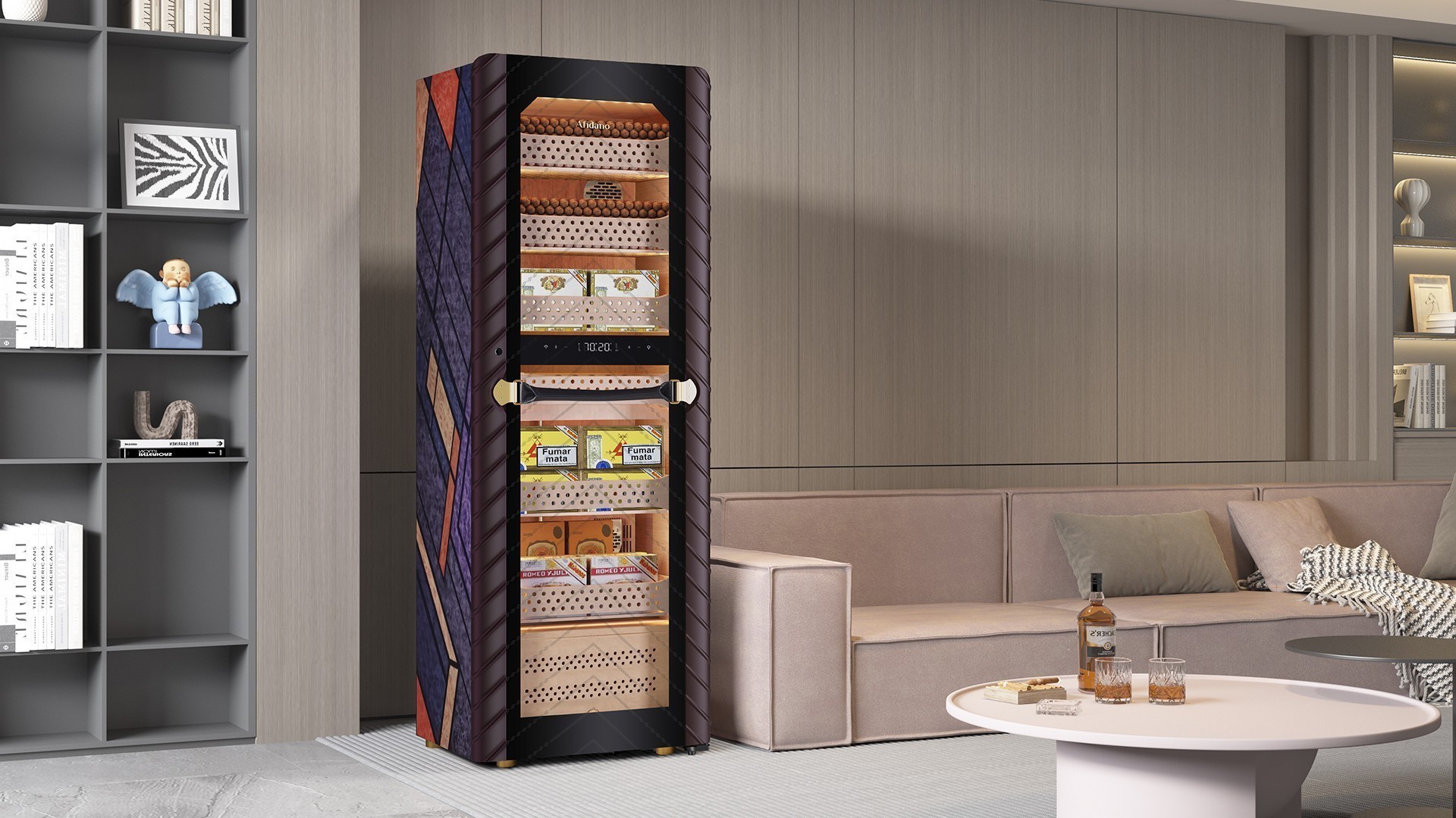 Хьюмидор для сигар Afidano | Афидано C8 — это выражение высокого вкуса, объединённого с инженерной страстью. Он не обещает эмоций, он их вызывает. Комбинация стильного корпуса, испанского кедра, HPR-системы и интерактивных функций создаёт устройство, которому просто нет равных по уровню реализации. Afidano C8 — это не просто устройство, а изысканное пространство для вашего табачного собрания. Его строгий, но элегантный корпус как будто создан для того, чтобы подчеркнуть характер владельца, а не привлечь лишнее внимание. Корпус хьюмидора выполнен в минималистичной геометрии, но с подчёркнуто необычной трактовкой плоскостей: фасеточные углы, продуманная симметрия, матовая глубина стенок и полированная кромка стекла создают контрастное, но гармоничное сочетание. Всё в этой форме будто рассчитано на игру света и отражений, чтобы каждый взгляд раскрывал новое измерение его дизайна. Внутри — пять роскошных выдвижных ящиков и отделка стенок из испанского кедра. Это не просто материал, это легенда хранения сигар: дерево стабилизирует микроклимат, заботясь о вкусе и аромате сигар, а мягкий свет подчёркивает текстуру кедра. Климатический контроль осуществляется через сенсорную панель, удобно интегрированную в корпус. Но есть и удалённая опция — управление через фирменное приложение Afidano, которое помогает следить за настройками даже во время отпуска. Добавьте к этому открытие с помощью отпечатка пальца — и вы получите устройство с уровнем защиты личной резиденции.