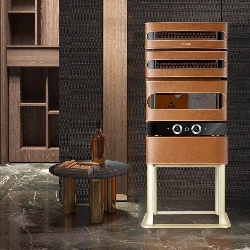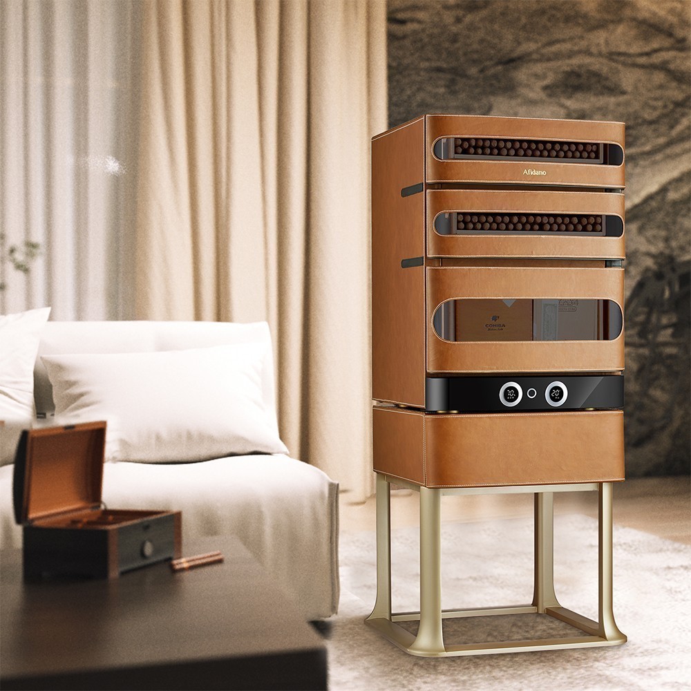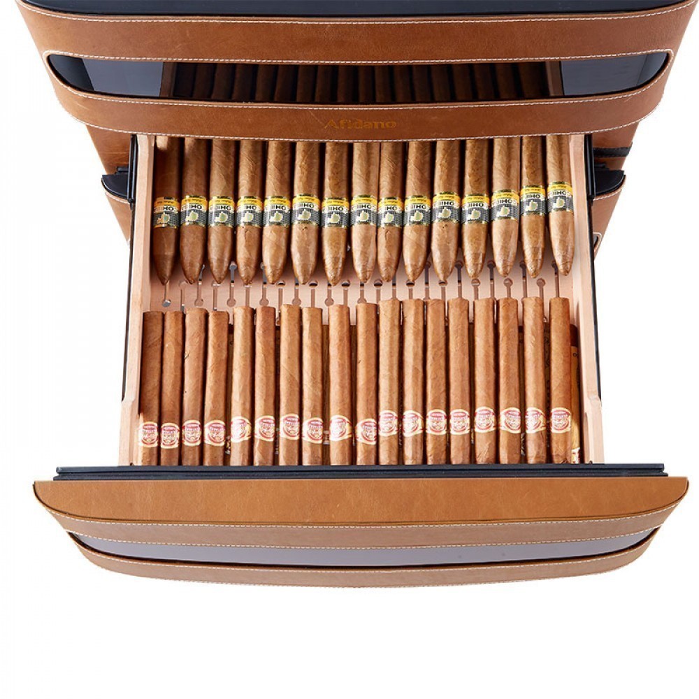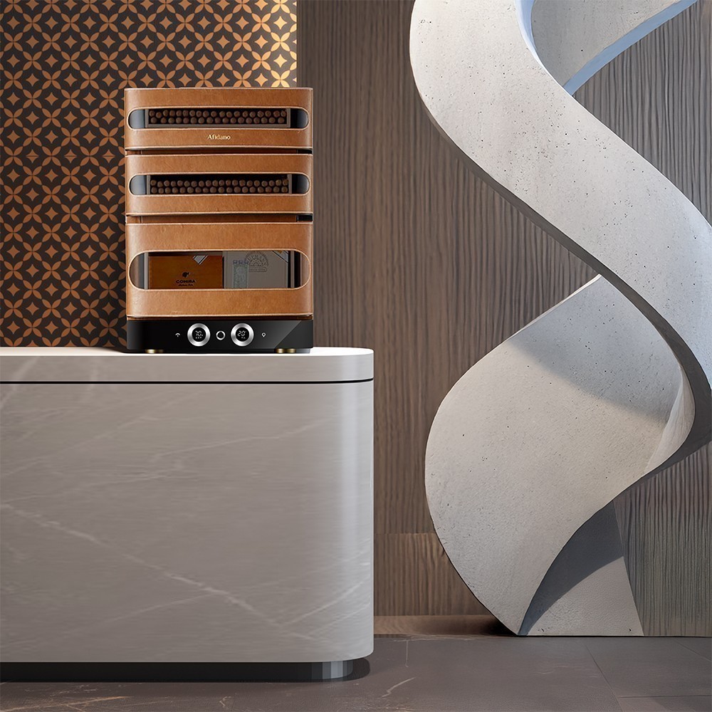 Хьюмидор для сигар Afidano | Афидано L3 (Коньячная кожа) — это больше, чем хранилище для сигар. Хьюмидор, в котором всё — от фактуры кожи до точной работы электроники — подчинено одной задаче: сохранить каждую сигару в идеальном состоянии и подать её в нужный момент. Корпус модели L3 (Коньячная кожа) вручную обтянут кожей — материалом, который не прощает компромиссов. Гладкая, плотная, с естественной фактурой, кожа проходит тщательную обработку, чтобы не просто украсить, а придать модели глубину и насыщенность. Со временем поверхность приобретает патину — индивидуальный отпечаток вашего стиля. Такой хьюмидор уместен в личном кабинете, сигарной комнате или респектабельной гостиной — в тех пространствах, где каждый предмет на своём месте. А чтобы хьюмидор надолго сохранил притягательный вид, нужно раз в месяц протирать его влажной мягкой тканью. Тогда кожа не потрескается и не растеряет лоск. Отделка из испанского кедра — неслучайный выбор. Этот благородный материал не только стабилизирует влажность, но и придаёт сигарам лёгкий древесный аромат. Три выдвижных ящика двигаются плавно, без зазоров и перекосов. Здесь удобно распределять коллекцию по формату, крепости или региону. Afidano L3 (Коньячная кожа) оснащён умной системой поддержания микроклимата HPR с точной цифровой настройкой. Температура регулируется в пределах от 16 до 22°C, влажность — от 60 до 75%. Панель настройки и мобильное приложение помогают управлять параметрами быстро и без лишнего шума. Стабильность без скачков — залог правильного созревания и сохранности аромата и вкуса каждой сигары в вашей коллекции. Встроенная подсветка мягко освещает содержимое, подчёркивая красоту древесины и формы сигар. Резервуар для воды удобно пополняется, а интеллектуальная система сама подскажет, когда пришло время долить воду. Для защиты предусмотрен биометрический сканер: доступ — только по отпечатку пальца. Это не просто удобно — это уважение к личному пространству владельца. Хоть L3 (Коньячная кожа) и рассчитан на 250 сигар, он не выглядит громоздким. Пропорции выверены, линии строгие, дизайн оригинален — хьюмидор можно как установить на специальную подставку, так и использовать без нее. А в самой съемной подставке есть ящик для сигарных принадлежностей. Он впишется в интерьер без показной демонстративности — он просто будет там, где ему положено быть.