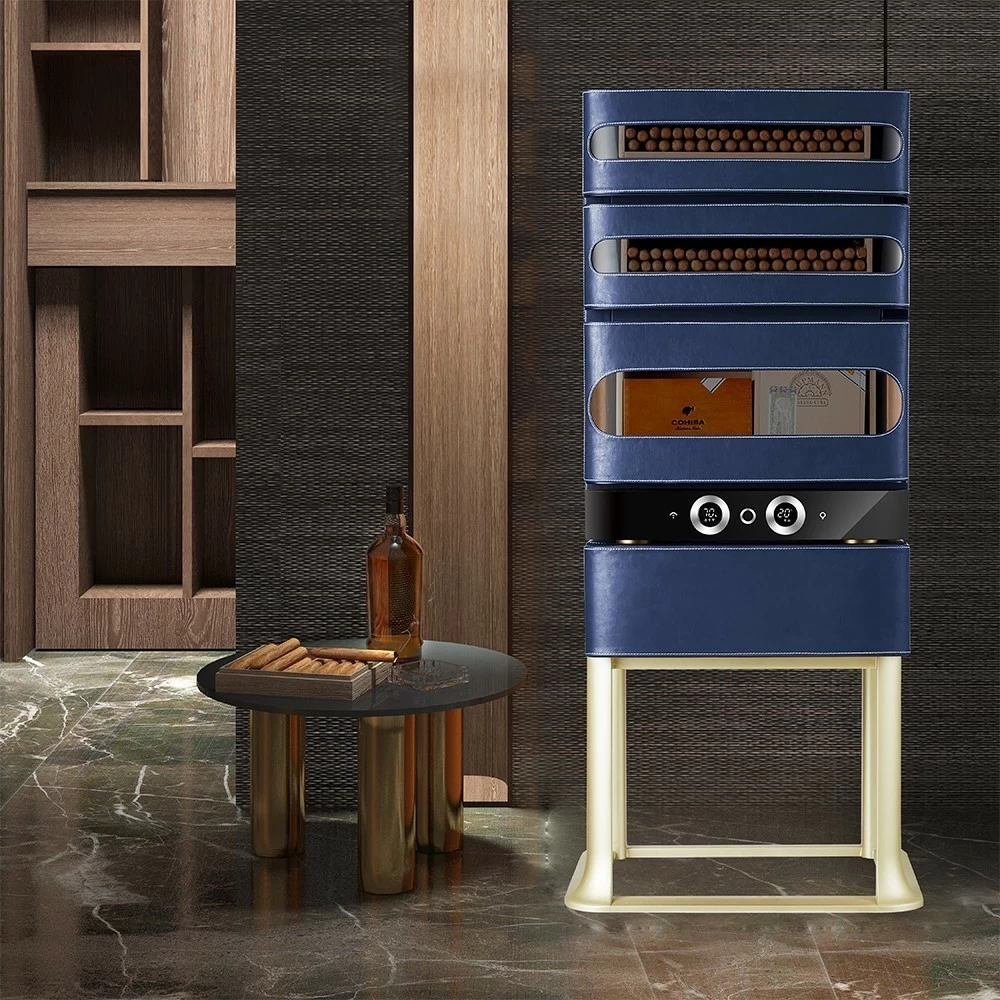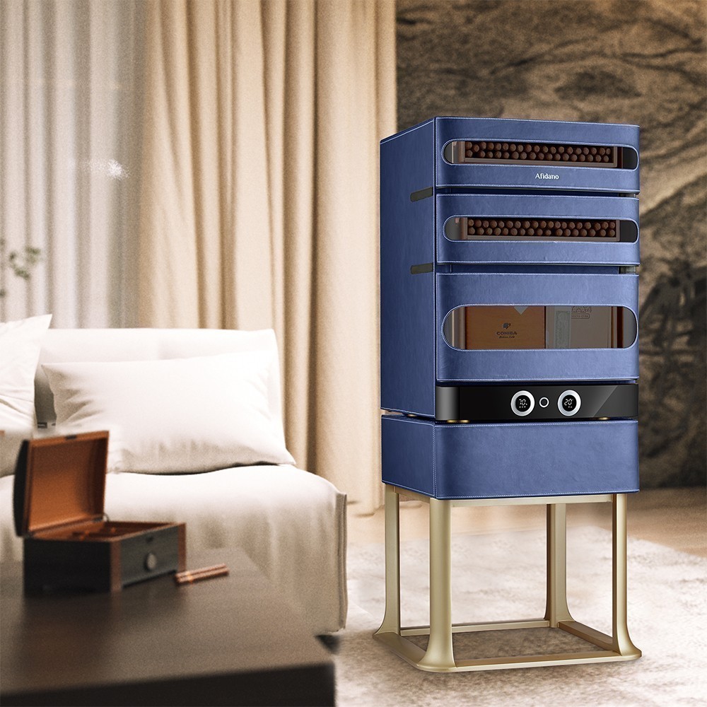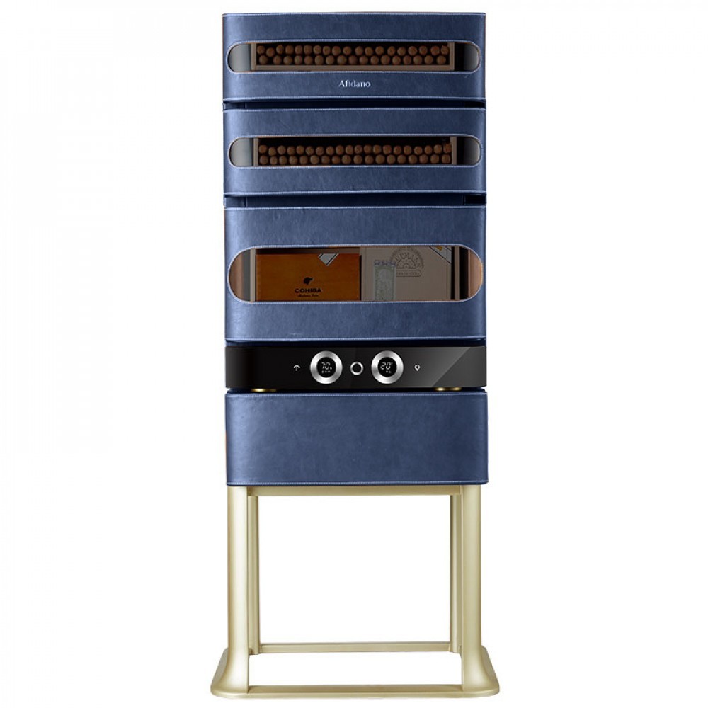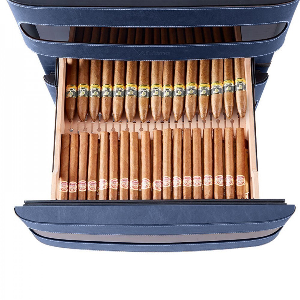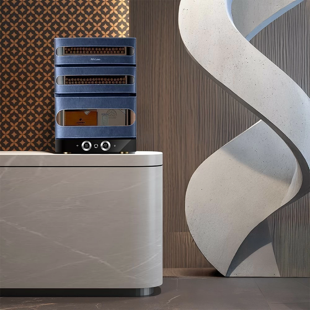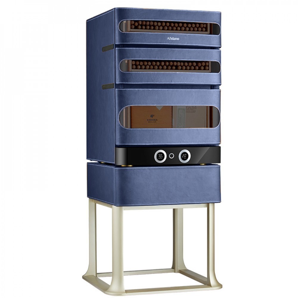 Хьюмидор для сигар Afidano | Афидано L3 (Королевский синий) — это больше, чем хранилище для сигар. Хьюмидор, в котором всё — от фактуры кожи до точной работы электроники — подчинено одной задаче: сохранить каждую сигару в идеальном состоянии и подать её в нужный момент. Корпус модели L3 (Королевский синий) вручную обтянут кожей — материалом, который не прощает компромиссов. Гладкая, плотная, с естественной фактурой, кожа проходит тщательную обработку, чтобы не просто украсить, а придать модели глубину и насыщенность. Со временем поверхность приобретает патину — индивидуальный отпечаток вашего стиля. Такой хьюмидор уместен в личном кабинете, сигарной комнате или респектабельной гостиной — в тех пространствах, где каждый предмет на своём месте. А чтобы хьюмидор надолго сохранил притягательный вид, нужно раз в месяц протирать его влажной мягкой тканью. Тогда кожа не потрескается и не растеряет лоск. Отделка из испанского кедра — неслучайный выбор. Этот благородный материал не только стабилизирует влажность, но и придаёт сигарам лёгкий древесный аромат. Три выдвижных ящика двигаются плавно, без зазоров и перекосов. Здесь удобно распределять коллекцию по формату, крепости или региону. Afidano L3 (Королевский синий) оснащён умной системой поддержания микроклимата HPR с точной цифровой настройкой. Температура регулируется в пределах от 16 до 22°C, влажность — от 60 до 75%. Панель настройки и мобильное приложение помогают управлять параметрами быстро и без лишнего шума. Стабильность без скачков — залог правильного созревания и сохранности аромата и вкуса каждой сигары в вашей коллекции. Встроенная подсветка мягко освещает содержимое, подчёркивая красоту древесины и формы сигар. Резервуар для воды удобно пополняется, а интеллектуальная система сама подскажет, когда пришло время долить воду. Для защиты предусмотрен биометрический сканер: доступ — только по отпечатку пальца. Это не просто удобно — это уважение к личному пространству владельца. Хоть L3 (Королевский синий) и рассчитан на 250 сигар, он не выглядит громоздким. Пропорции выверены, линии строгие, дизайн оригинален — хьюмидор можно как установить на специальную подставку, так и использовать без нее. А в самой съемной подставке есть ящик для сигарных принадлежностей. Он впишется в интерьер без показной демонстративности — он просто будет там, где ему положено быть.