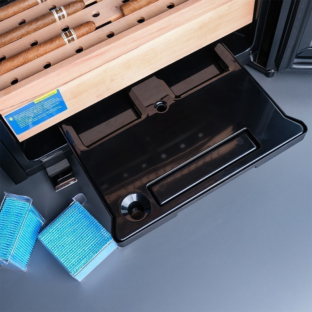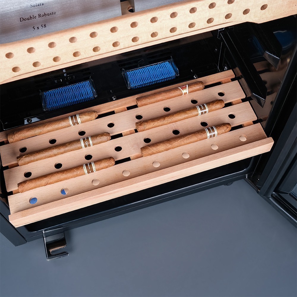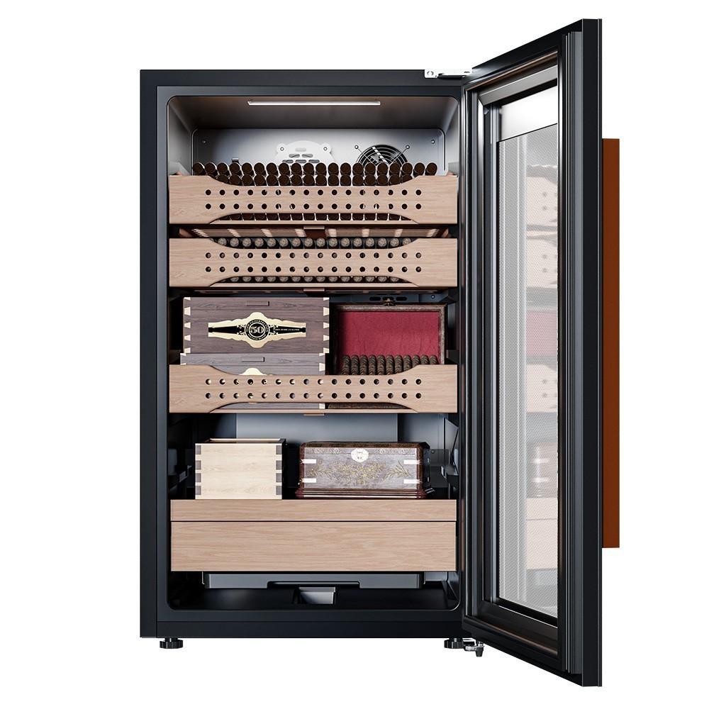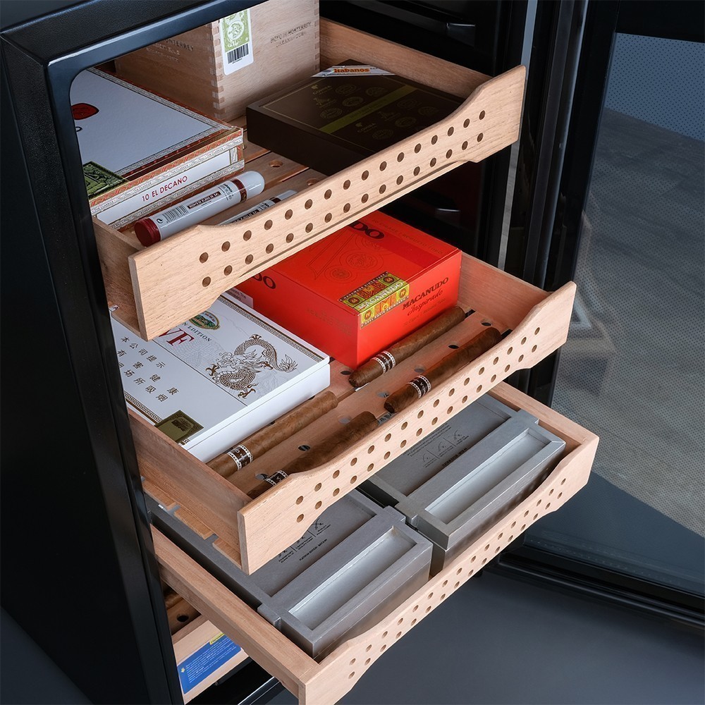 Хьюмидор для сигар Meyvel | Мэйвел MC-120BK (PRO) — выбор ценителей сигар. Этот премиальный хьюмидор с впечатляющим внутренним объемом 113 литров, способным вместить до 850 сигар. Особенность модели — точный температурный контроль в диапазоне от +16 до +22°C и уровень влажности 60-75%, что позволяет поддерживать оптимальные условия для хранения и бережного созревания табачных изделий. Внутренняя подсветка и встроенный гигрометр упрощают мониторинг состояния коллекции. Управляется хьюмидор с помощью сенсорной панели, а дверь, оснащенная магнитным уплотнителем, открывается с помощью отпечатка пальца, обеспечивая защиту содержимого. Хьюмидор устойчиво будет стоять на любой поверхности, благодаря регулируемым ножкам. Четыре выдвижных ящика, выполненных из испанского кедра, придают Meyvel MC-120BK (PRO) законченный и стильный внешний вид, который гармонично вписывается в интерьер. Сочетание передовых технологий, продуманной конструкции и качественного исполнения делают этот хьюмидор выбором ценителей сигар, желающих сохранить коллекцию в оптимальном состоянии.