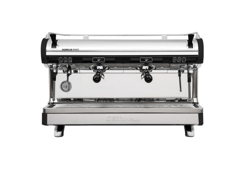 Традиционная полуавтоматическая кофемашина Nuova Simonelli Aurelia Wave 2 Gr S | Нуова Симонелли Аурелья 2 группы с с подключением к водопроводу предназначена для приготовления кофе эспрессо и капучино. Оснащена двумя высокими группами, экономайзером, краном для подачи горячей воды, двумя паровыми кранами из нержавеющей стали и LED-подсветкой рабочей поверхности. Предусматривает ручную дозацию кофе, горячей воды и пара. Бойлер изготовлен из меди, корпус из нержавеющей стали с вставками из ABS-пластика (на выбор предлагаются два цвета - чёрный и жемчужный).