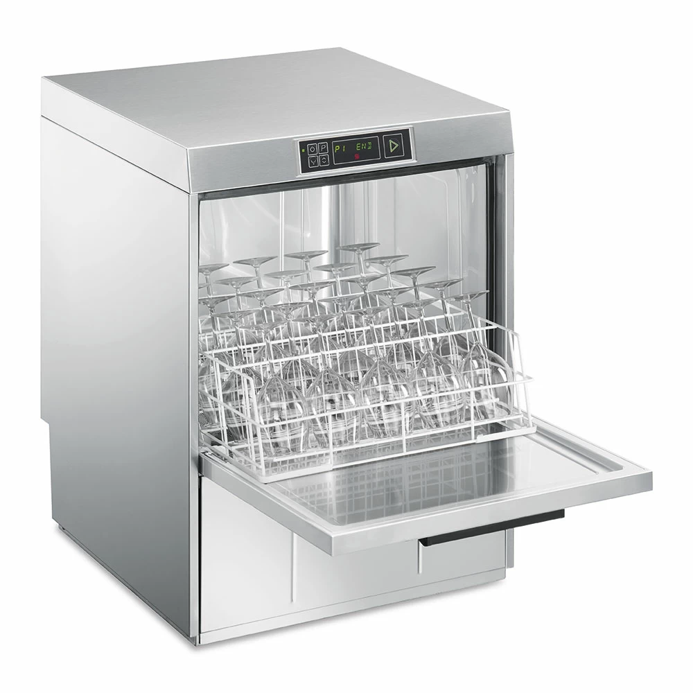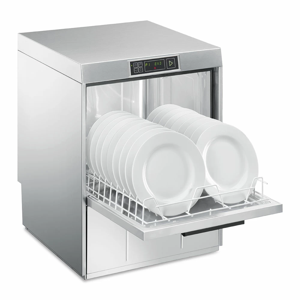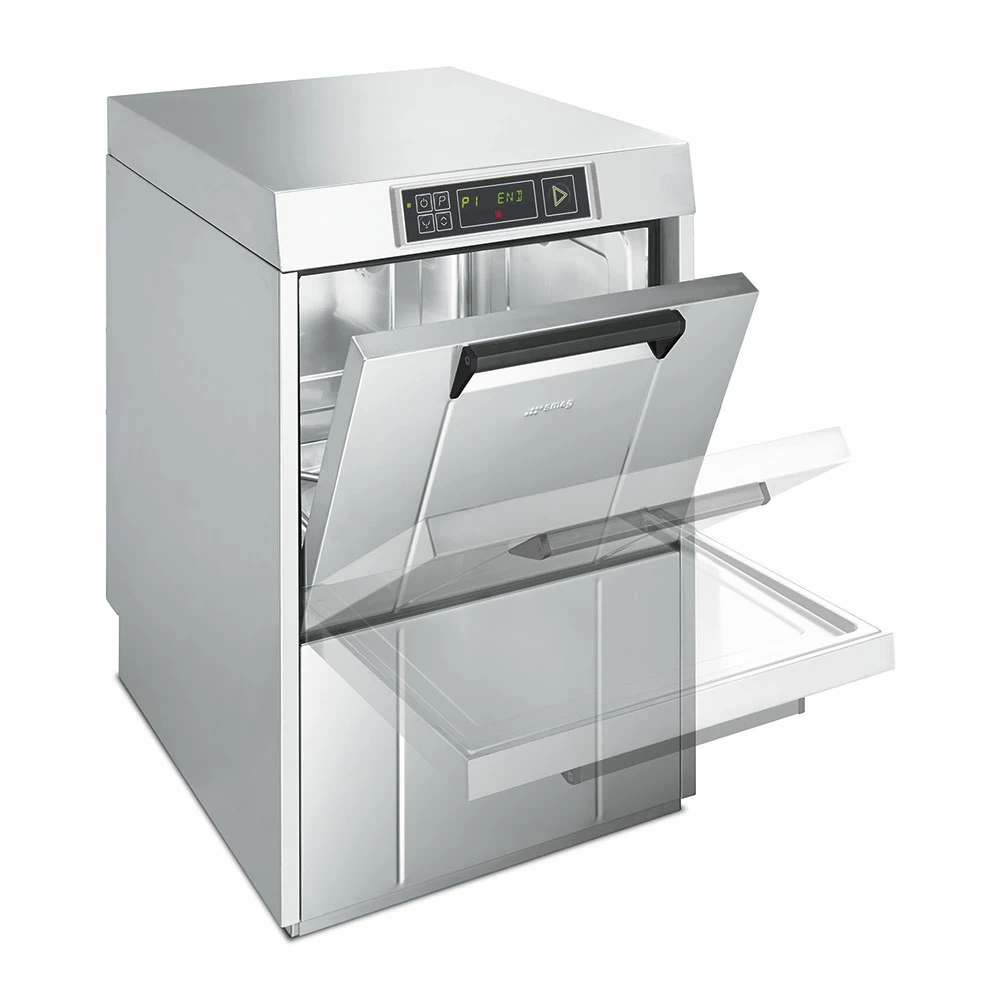Машина посудомоечная Smeg | Смег Easyline SPD515S. Посудомоечная машина под столешницу. 6 автоматических программ; 1 полностью программируемая программа; Программы самоочистки. Максимальное количество кассет в час: 60. Максимальное количество тарелок в час: 1080. Максимальное количество бокалов в час: 2160. Количество противней: 7 x GN 1/1 (530 x 325 mm). Давление на входе: 100-1000 kPa. Максимальная жесткость воды: 54°f - 30°dH. 5-ступенчатая система фильтрации. Объем моечного бака: 11 л. Объем бойлера: 6.5 л. Класс защиты: IPX4. Регулируемые по высоте ножки.