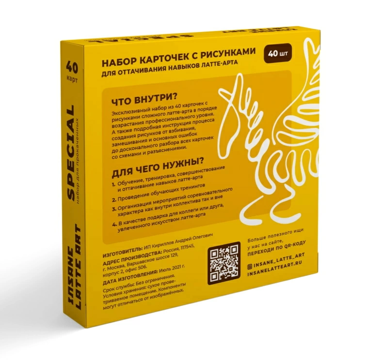 В наборе 40 карточек с рисунками сложного латте-арта профессионального уровня. А также подробная инструкция, благодаря которой ваше обучение станет в разы легче. В ней описан процесс приготовления рисунков от взбивания и замешивания до досконального разбора всех карточек со схемами последовательности и направления, включая разбор основных ошибок.
