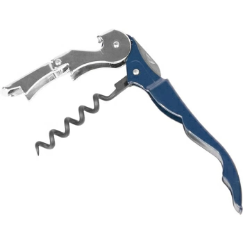 Нарзанник двухступенчатый Пуллт АПС 115 мм синий - обязательное приспособление для качественной работы сомелье, это штопор рычажного типа, имеет встроенную винтообразную открывалку и небольшой нож для срезания капсулы. Опорное колено упрощает процесс откупоривания бутылки. Одноступенчатый нарзанник имеет одну зазубрину на рабочей части или два опорных колена.
