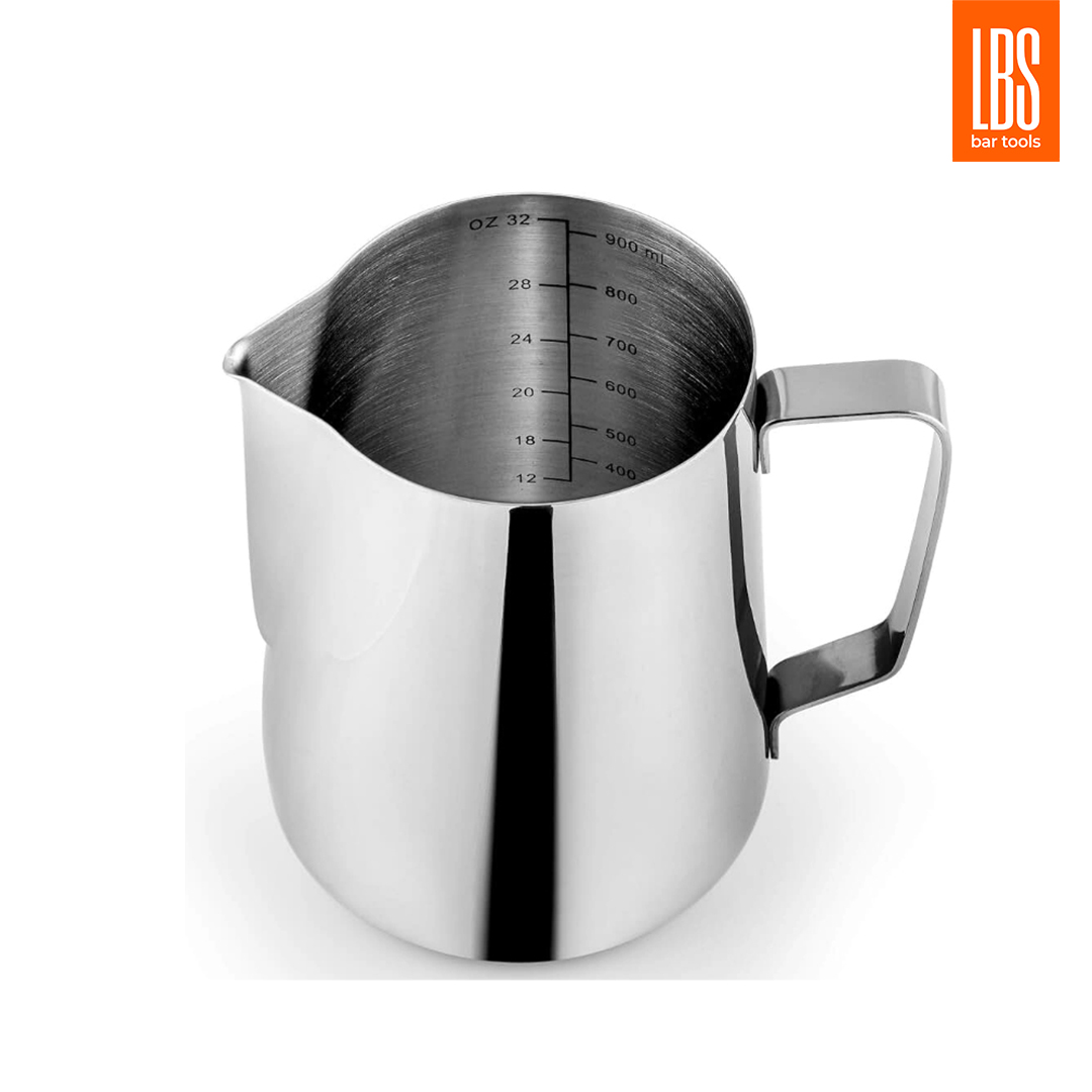 Питчер LBS 1000 с разметкой. Металлический молочник в форме усеченного конуса, с плоской ручкой.