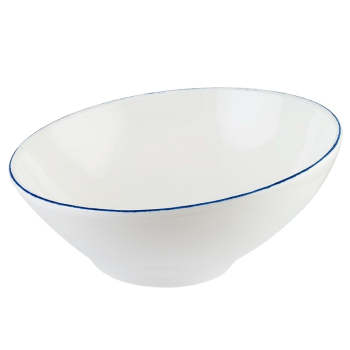 Салатник Bonna Retro | Бонна Ретро 350 мл синий край, форма Ванто. Bonna — профессиональный твердый фарфор. В коллекции Retro контрастные цветные линии, нарисованные вручную по краю, что делает ее идеальной для повседневного ужина, в то же время она достаточно изысканная, чтобы стать ярким акцентом. Фарфор Bonna отличается своей прочностью, устойчивостью к сколам и механическим воздействиям, что делает его идеальным для профессионального использования. Все изделия можно мыть в посудомоечной машине и использовать в СВЧ-печах.