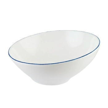 Салатник Bonna Retro | Бонна Ретро 450 мл синий край, форма Ванто. Bonna — профессиональный твердый фарфор. В коллекции Retro контрастные цветные линии, нарисованные вручную по краю, что делает ее идеальной для повседневного ужина, в то же время она достаточно изысканная, чтобы стать ярким акцентом. Фарфор Bonna отличается своей прочностью, устойчивостью к сколам и механическим воздействиям, что делает его идеальным для профессионального использования. Все изделия можно мыть в посудомоечной машине и использовать в СВЧ-печах.