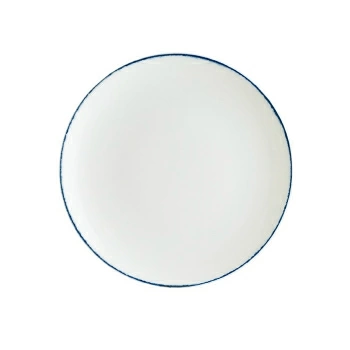 Тарелка Bonna Retro | Бонна Ретро Д=270 мм синий край. Bonna — профессиональный твердый фарфор. В коллекции Retro контрастные цветные линии, нарисованные вручную по краю, что делает ее идеальной для повседневного ужина, в то же время она достаточно изысканная, чтобы стать ярким акцентом. Фарфор Bonna отличается своей прочностью, устойчивостью к сколам и механическим воздействиям, что делает его идеальным для профессионального использования. Все изделия можно мыть в посудомоечной машине и использовать в СВЧ-печах.