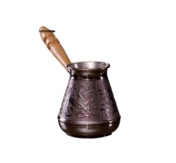 Турка медная Лань 500 мл прекрасно подходит для приготовления настоящего кофе на плите. Медная турка (ибрик) конической формы, с длинной теплоизоляционной деревянной ручкой. Джезва декорирована рельефным изображением, что придает изделию оригинальный внешний вид.