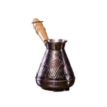 Турка медная Станица "Орел" 300 мл прекрасно подходит для приготовления настоящего кофе на плите. Медная турка (ибрик) конической формы, с длинной теплоизоляционной деревянной ручкой. Джезва декорирована рельефным изображением, что придает изделию оригинальный внешний вид.