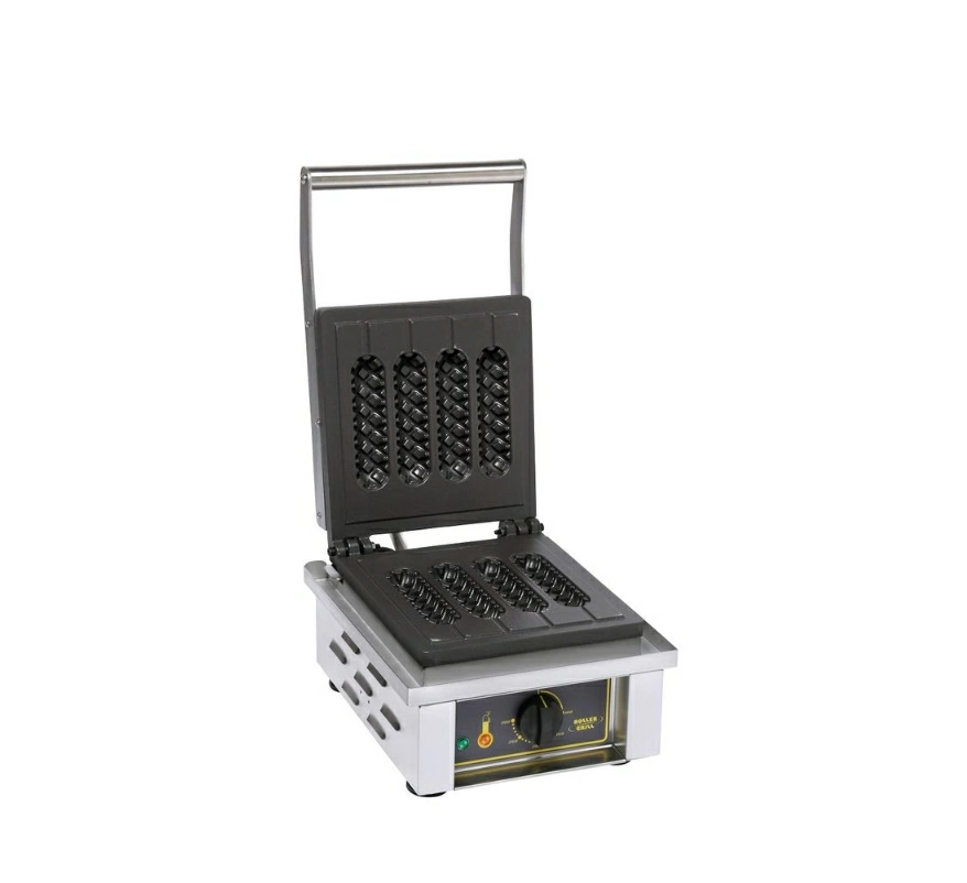 Вафельница Roller Grill | Роллер Гриль GES80 для выпекания объемных вафель на палочке - корн-догов. Одновременно возможно выпекание 4-х корн-догов. Пресс-форма выполнена из чугуна, материал обеспечивает равномерную степень прогрева теста на любом участке. Температура регулируется механическим переключателем на передней панели управления. Максимальная рабочая температура 300 °С. Выступающий по периметру жарочной площадки съемный поддон собирает крошки и лишнее тесто. Размер вафли (корн-дога) - 155х40х40 мм.