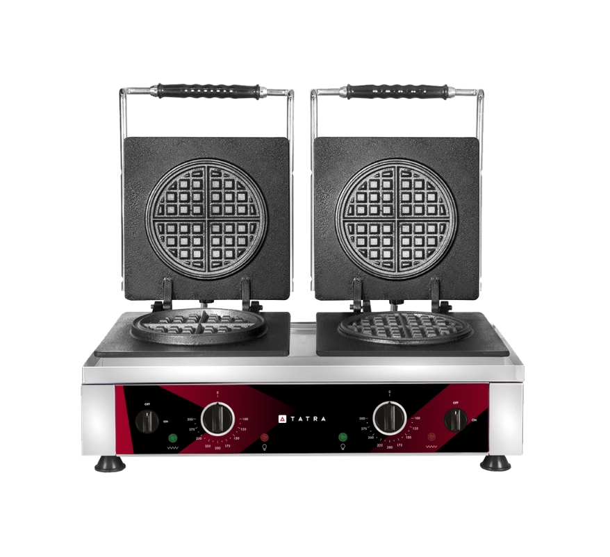 Вафельница Tatra | Татра TWI 2 AMERICAN предназначена для выпечки американских вафель. Модель оснащена электромеханической панелью управления с терморегулятором, 2 зонами выпечки с независимым управлением, емкостью для сбора жира и индикаторами питания и нагрева. Корпус выполнен из нержавеющей стали, несъемные рабочие поверхности - из чугуна. Диаметр вафли 160 мм. Температурный режим: от 50 до 300 °C.