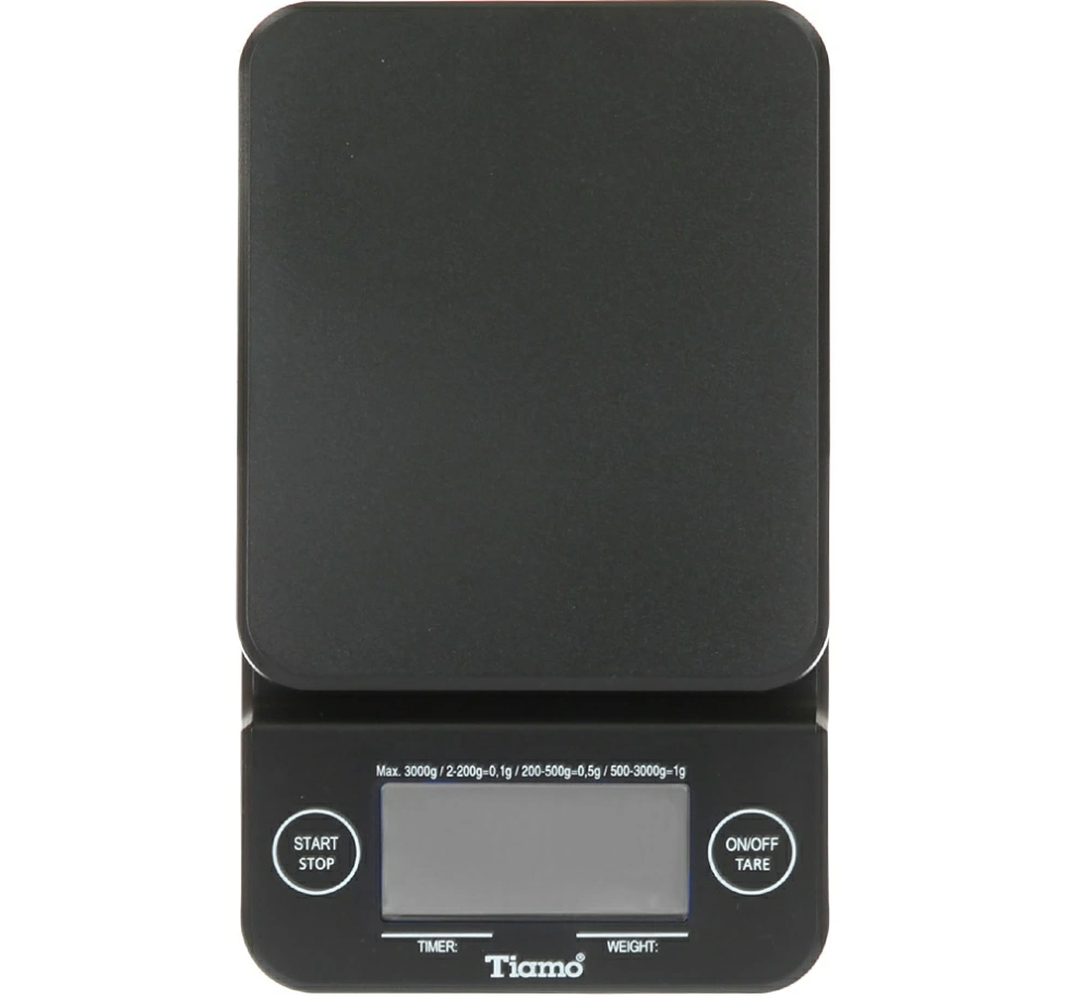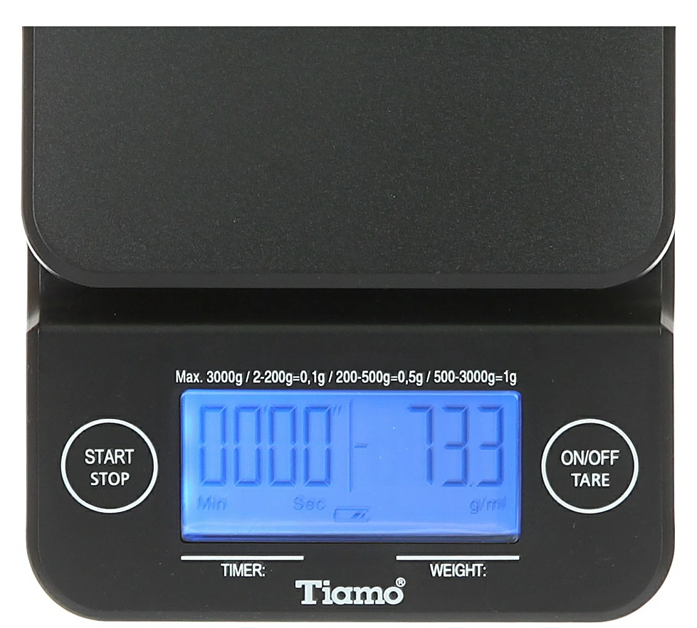 Весы Tiamo | Тиамо HK0513BK-1 используются на предприятиях общественного питания и торговли для точного взвешивания пропорций ингредиентов, необходимых для приготовления напитков. Платформа выполнена из нержавеющей стали, корпус - из пластика. Специально разработанная шкала показывает не только количество молотого кофе, но и необходимый объем горячей воды и время заваривания. Источник питания: 2 батарейки размера ААА.