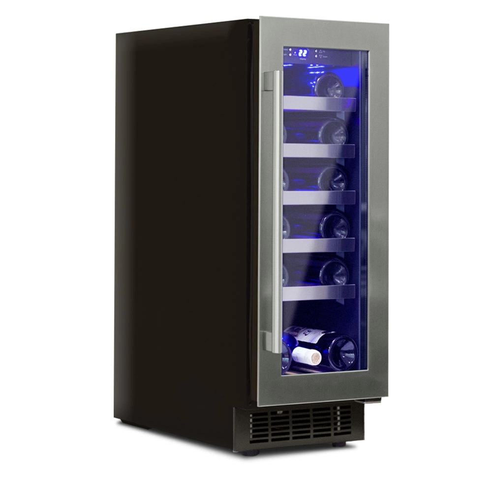 Винный шкаф Cold Vine | Колд Вайн C18-KST1. Компактный и лаконичный винный шкаф вмещает в себя 20 бутылок вина типа бордо при установке всех полок. Модель оснащена внутренним вентилятором для равномерного доступа холодного воздуха ко всем полкам шкафа и внешним вентилятором для быстрого и эффективного охлаждения компрессора. Комплектуется холодильник C18-KST1 шестью полками из массива бука. Надежная фиксация полок исключает возможность малейших вибраций и колебаний внутри шкафа. В верхней части шкафа находится интуитивно-понятная электронная панель управления, с легкостью регулируйте температуру и освещение внутри шкафа. Дизайн модели подойдет для любой современной кухни, бара или гостиной. Корпус винного шкафа выполнен из металла чёрного цвета, дверца обшита бесшовной нержавеющей сталью. Тройное защитное стекло защитит Вашу винную коллекцию от вредного воздействия солнечных лучей и поможет создать идеальный микроклимат винного погреба внутри шкафа. Удобная накладная ручка из нержавеющей стали легко снимается и устанавливается на дверцу. Цифровой индикатор температуры и внутреннее освещение – на светодиодах синего цвета. Не рекомендуется устанавливать прибор на полы с подогревом без специальной термоизолирующей подложки. Слишком низкая температура окружающей среды также может быть причиной неправильной работы изделия.