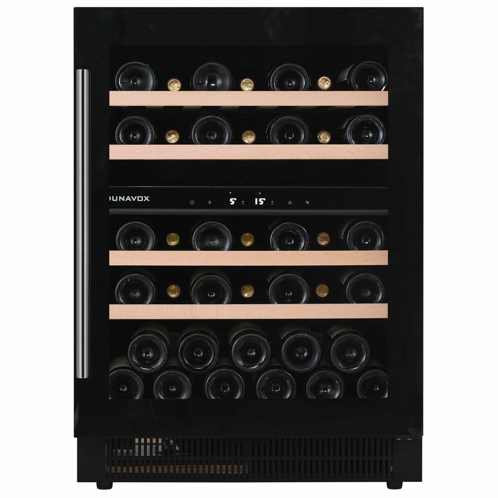 Винный шкаф Dunavox | Дунавокс DAUF-39.121DB. Компрессорный винный шкаф обладает средней вместимостью и способен разместить в себе до 39 бутылок. Располагаются они на выдвижных полках из массива бука. Внутреннее пространство шкафа разделено на 2 температурные зоны с возможностью настраивать каждую из них в диапазоне от +5 °C до +20 °C. Электронный термостат помогает стабильно поддерживать заданную Вами температуру. Холодильник поддерживает влажность в диапазоне 60-80%, как в настоящем винном погребе. Для дополнительного повышения влажности предусмотрен контейнер для дистиллированной воды. Наличие «Зимнего режима» даёт возможность повысить температуру внутри шкафа, если температура в помещении упала ниже установленной для хранения вина. Угольный фильтр очищает воздух и предотвращает появление посторонних запахов, которые могут испортить вкус напитка. Лаконичный дизайн шкафа придаёт интерьеру современный вид. Чёрный корпус и рамка добавляют элегантности и солидности. В этой модели использовано панорамное освещение синего, янтарного и белого цвета, которое обеспечивает равномерную подсветку всех полок. (Освещение плавно включается при открывании дверцы, а через пару секунд после закрытия плавно гаснет.) Дополнительно у данной модели шкафа предусмотрен демонстрационный режим, во время которого освещение не гаснет. Такая функция помогает демонстрировать винную коллекцию Вашим друзьям и близким. Удобное и понятное сенсорное управление, исключает вероятность случайного нажатия. Если Вы забыли или не до конца закрыли шкаф – сигнализатор двери оповестит об этом. Для людей, соблюдающих религиозные обычаи предусмотрен режим «Шаббат» (суббота). При этом режиме отключается освещение, дисплей и звуковые сигналы при нажатии на кнопки. Винный шкаф DAUF-39.121DB – современное решение в вопросе хранения вин.