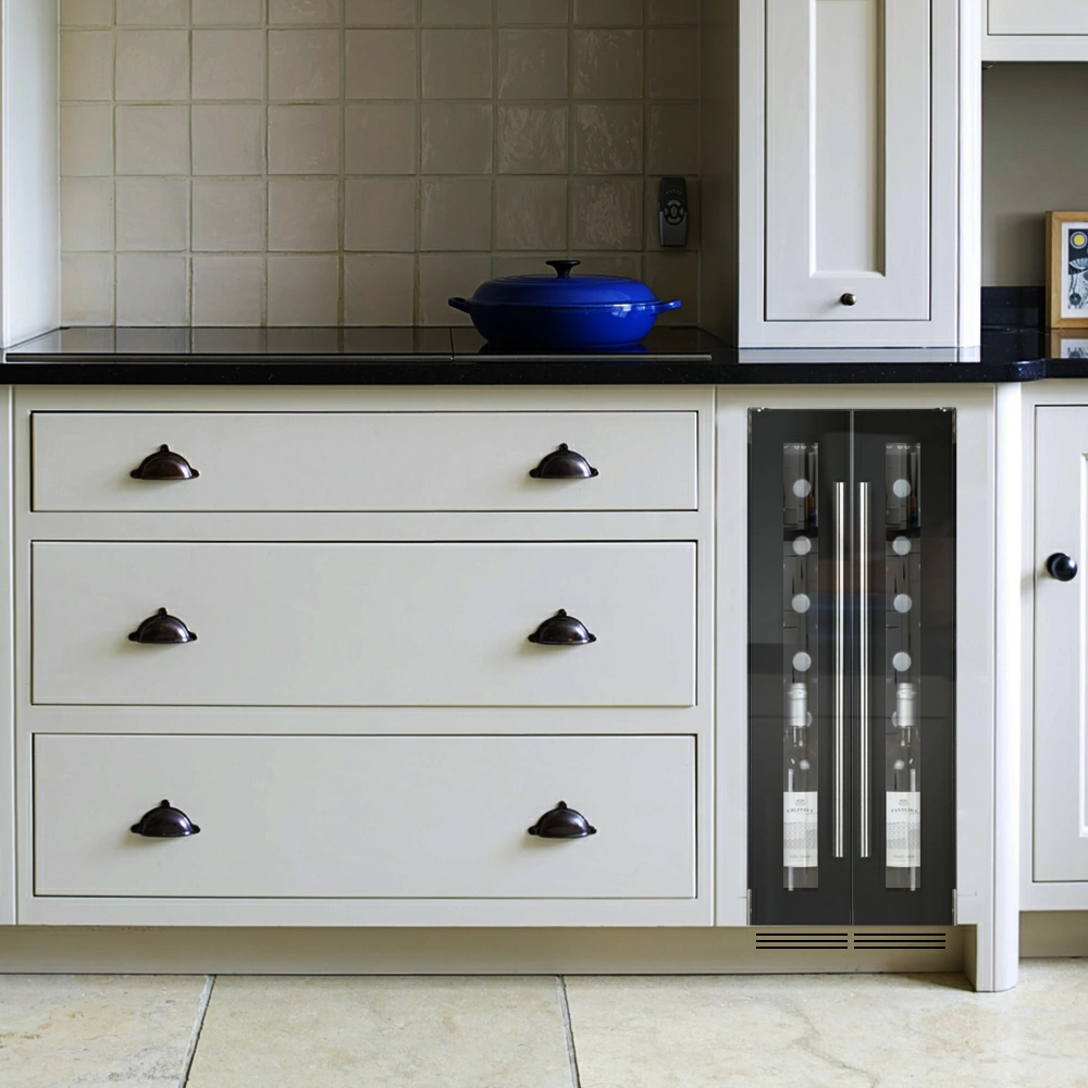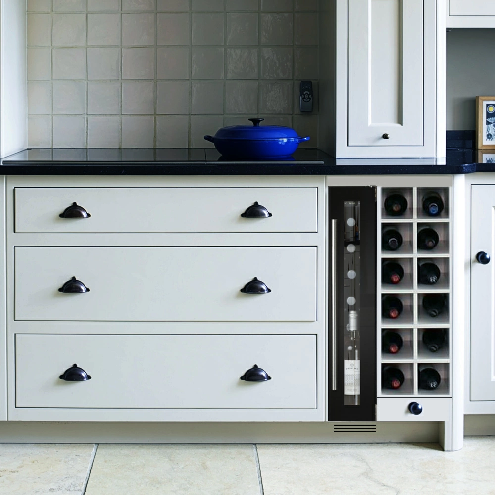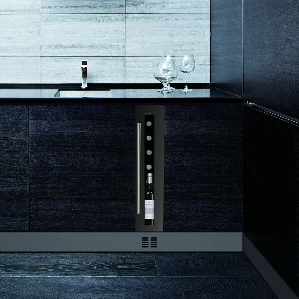 Винный шкаф Dunavox | Дунавокс DAUF-9.22B. Компрессорный винный шкаф обладает небольшой вместимостью и способен разместить в себе до 9 бутылок. Располагаются они на полках из массива бука. В качестве дополнительной функции, производители Dunavox разработали реверсивную дверь. Это поможет разместить шкаф в удобном для Вас месте или расположить две модели рядом, создав технологию открытия side-by-side. Внутреннее пространство шкафа имеет одну температурную зону с возможностью настраивать её в диапазоне от +5 °C до +20°C. Электронный термостат помогает стабильно поддерживать заданную Вами температуру. Холодильник поддерживает влажность в диапазоне 60-80%, как в настоящем винном погребе. Лаконичный дизайн шкафа придаёт интерьеру современный вид. В этой модели использовано освещение синего цвета, которое обеспечивает равномерную подсветку всех полок. Удобное и понятное сенсорное управление, исключает вероятность случайного нажатия. Винный шкаф DAUF-9.22B – современное решение в вопросе хранения вин.
