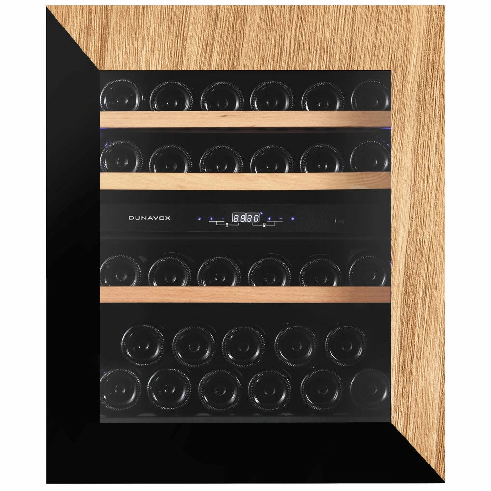 Винный шкаф Dunavox | Дунавокс DAVG-32.80DOP.TO. Установить его можно в нишу или колонну Вашего мебельного гарнитура. Ножки регулируются под нужную высоту. Модель идеально вписывается в любой подходящий для Вас интерьер гостиной кухни, бара или кабинета. После установки у данного винного шкафа сохраняется функция Touch Open. Дверца открывается во время прикосновения Вашей руки к стеклу. При необходимости можно установить ручку из нержавеющей стали и настроить чувствительность сенсора. В качестве дополнительной функции, производители Dunavox разработали реверсивную дверь. Это поможет разместить шкаф в удобном для Вас месте или расположить две модели рядом, создав технологию открытия side-by-side. Тройное стекло с защитой от прямых УФ-лучей поддерживает качественные условия хранения вина. Встроенная система вентиляции создаёт необходимую циркуляцию воздуха для правильной работы винного холодильника. Компрессорный винный шкаф Dunavox DAVG-32.80DOP.TO обладает средней вместимостью и способен разместить в себе до 32 бутылок. Располагаются они на выдвижных полках из массива бука. Внутреннее пространство шкафа разделено на 2 температурные зоны с возможностью настраивать каждую из них в диапазоне от +5 °C до +20 °C. Электронный термостат помогает стабильно поддерживать заданную Вами температуру. Холодильник поддерживает влажность в диапазоне 60-80%, как в настоящем винном погребе. Для дополнительного повышения влажности предусмотрен контейнер для дистиллированной воды. Угольный фильтр очищает воздух и предотвращает появление посторонних запахов, которые могут испортить вкус напитка.