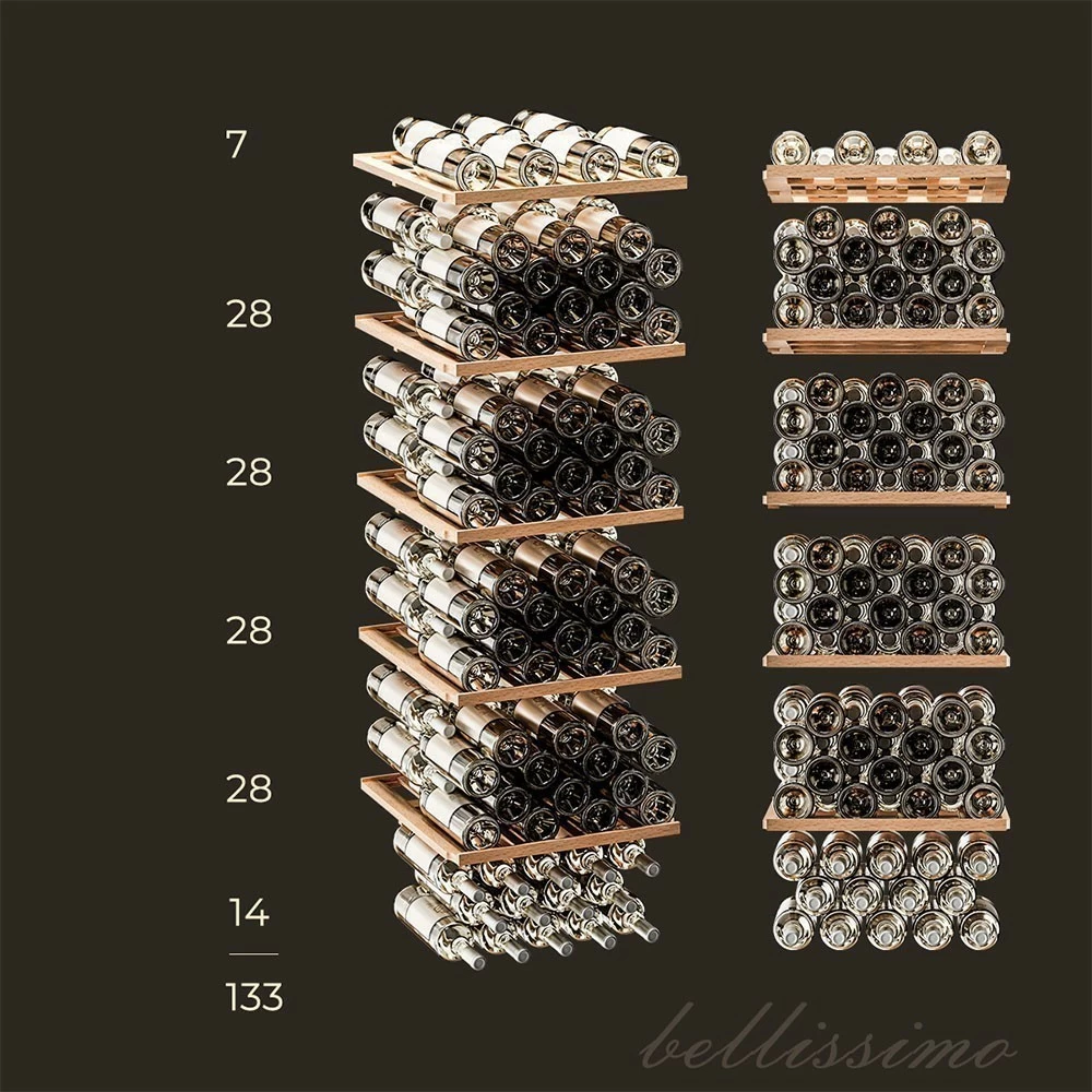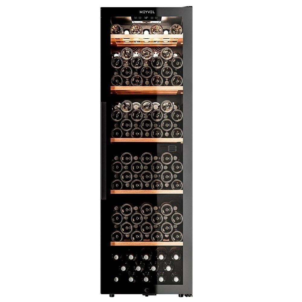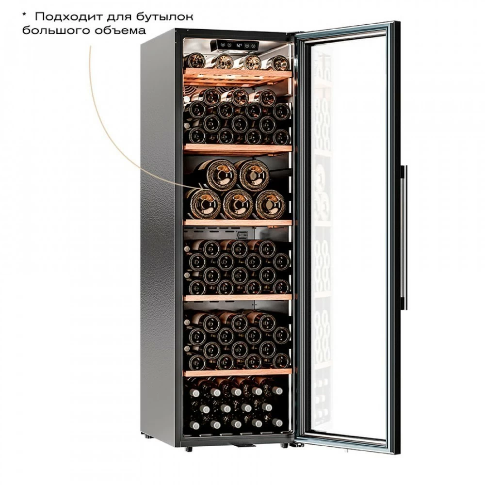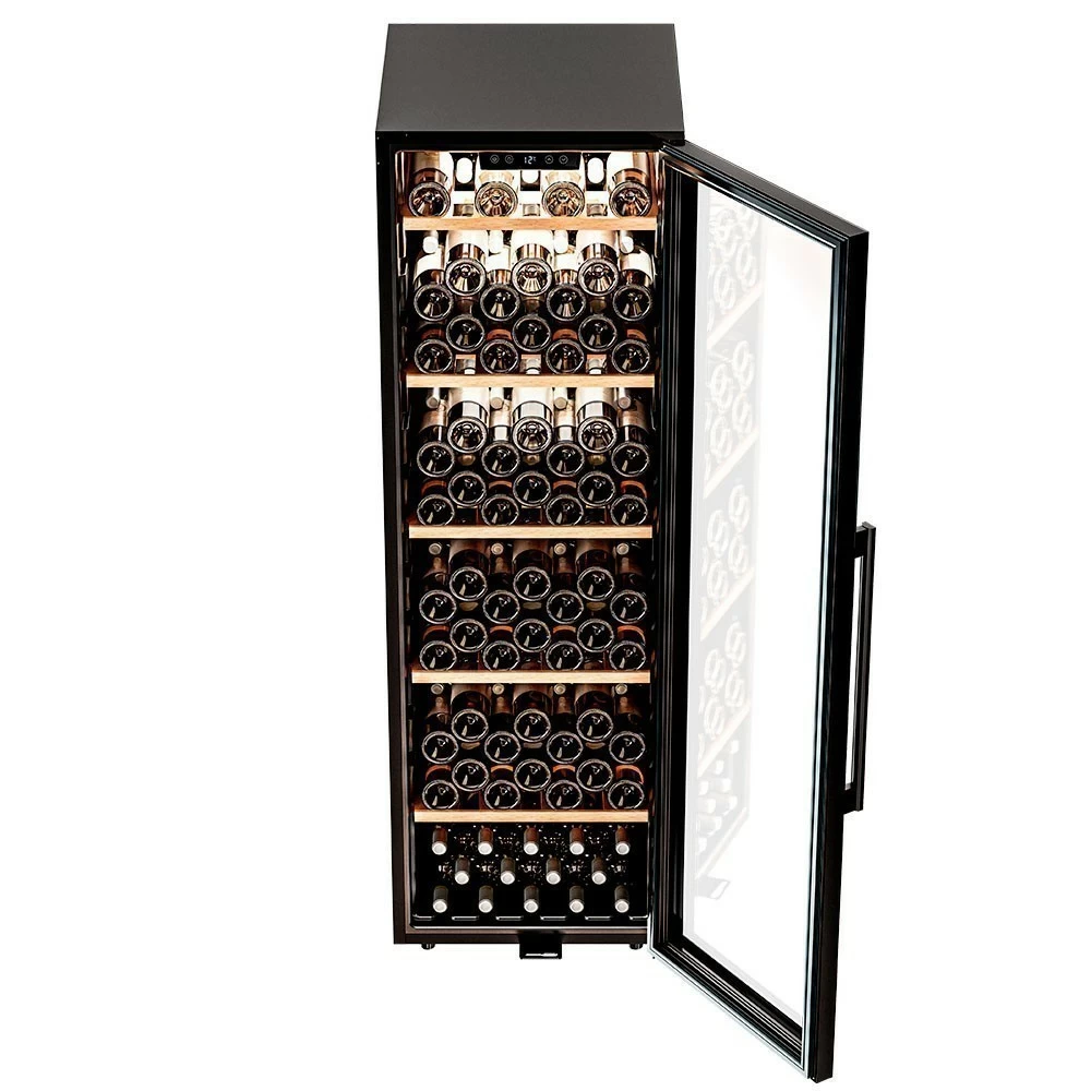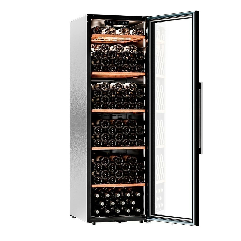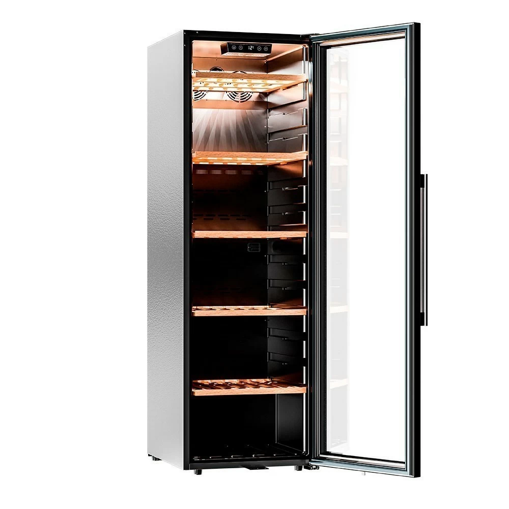 Винный шкаф Meyvel | Мэйвел MV133-KBF1 — идеальное решение для истинных ценителей вина, который вмещает до 133 бутылок вашего любимого напитка и хранит их в оптимальных условиях. Meyvel MV133-KBF1 поддерживает температуру от +5 до +20°C, которая идеальна для белых, красных вин и шампанского. Благодаря большому расстоянию между полками в шкаф помещаются не только бутылки 0,75 л типа «Бордо», но и большего объема, бутылки также можно устанавливать стоя. Модель MV133-KBF1 оснащена компрессорной системой охлаждения, которая отличается высокой эффективностью и долговечностью. Компрессор создает холод, путем сжатия хладагента и его последующего расширения, поэтому винный шкаф быстро достигает нужной температуры и стабильно ее поддерживает. Meyvel MV133-KBF1 — отдельностоящее устройство, поэтому можно разместить его в любом удобном месте ресторана, отеля, бара или домашней винной комнаты без встраивания в мебель. Это удобно не только для создания стиля и атмосферы в интерьере, но и для предоставления легкого доступа к винам. Модель оснащена пятью полками из дерева, что не только выглядит стильно, но и способствует правильной циркуляции воздуха внутри шкафа. Дополнительно можно установить до 8 полок, а также приобрести демонстрационную полку и полку для фужеров. Тройное стекло с УФ-фильтром надежно защищает вино от вредного воздействия света, что сохраняет его уникальный вкус и аромат. Управление осуществляется через сенсорную панель, а настройка интуитивно понятна. Также предусмотрены важные функции для защиты винотеки: замок на двери для безопасности, угольный фильтр, который очищает воздух внутри шкафа от посторонних запахов, сигнализация отклонения температуры, которая предупреждает о любых изменениях в условиях хранения, и блокировка панели управления, предотвращающая случайные изменения настроек. Регулируемые ножки предоставляют возможность установить шкаф на любой поверхности, компенсируя неровности пола и обеспечивая стабильность конструкции. Винный шкаф Meyvel MV133-KBF1 — это сочетание стиля, функциональности и надежности, которое станет надежным помощником в создании винной коллекции.