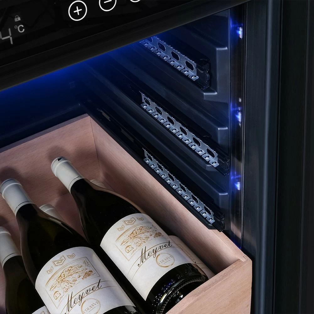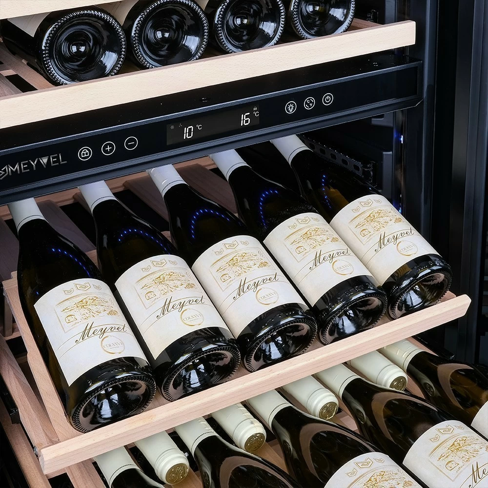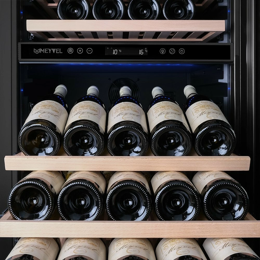 Винный шкаф Meyvel | Мэйвел MV154PRO-KBT3 — идеальное место хранения и демонстрации коллекции вин в ресторанах, барах или винных комнатах. Он вмещает внушительную винотеку до 154 бутылок типа «Бордо», а если размер бутылки нестандартный, то съемные полки решат эту проблему. Три независимые температурные зоны для разных сортов напитков: верхняя поддерживает температуру от +5 до +20°C, средняя — от +5 до +12°C, нижняя — от +12 до +20°C. Подсветка белого, синего или янтарного цвета создает правильную атмосферу для эффектной демонстрации содержимого. Модель MV154PRO-KBT3 может быть как отдельностоящей, так и встроенной в нишу, а перенавешиваемая дверь предоставляет возможность разместить ее в любом удобном месте. Стоит отметить низкий уровень шума — всего 41 дБ, поэтому холодильник для вина не потревожит владельца неприятными громкими звуками. Для вашего спокойствия Meyvel MV154PRO-KBT3 оснащен системой сигнализации, которая оповестит об отклонениях температуры, функцией блокировки панели управления, предотвращающей случайные изменения настроек, и замком. Угольный фильтр очищает воздух внутри шкафа от посторонних запахов. Надежный, функциональный и стильный винный шкаф Meyvel MV154PRO-KBT3 станет достойным украшением ресторана, бара, гостиницы или кухни опытного коллекционера.