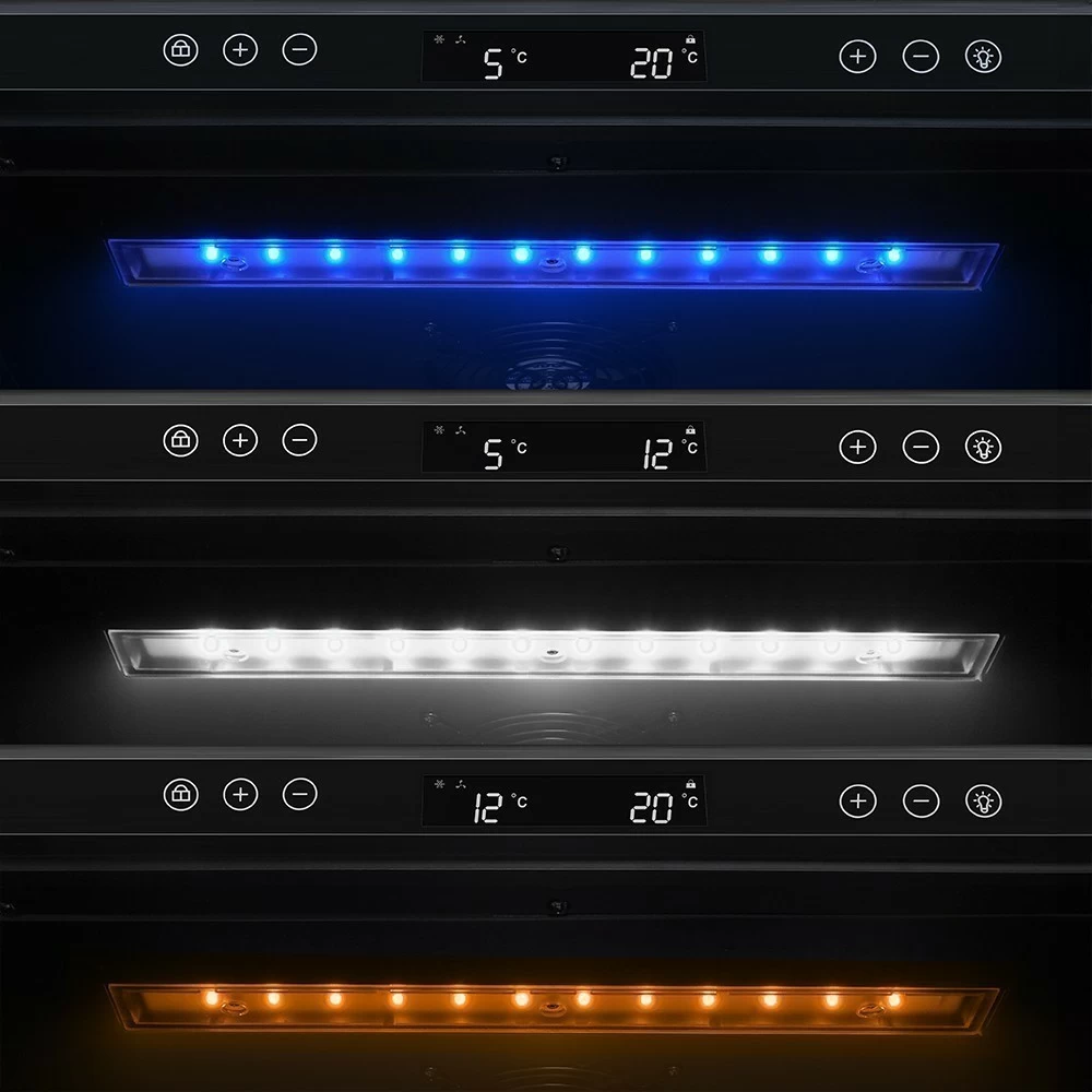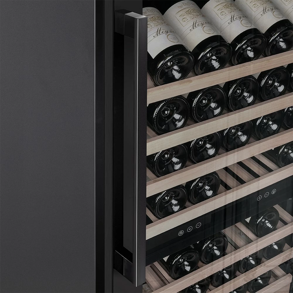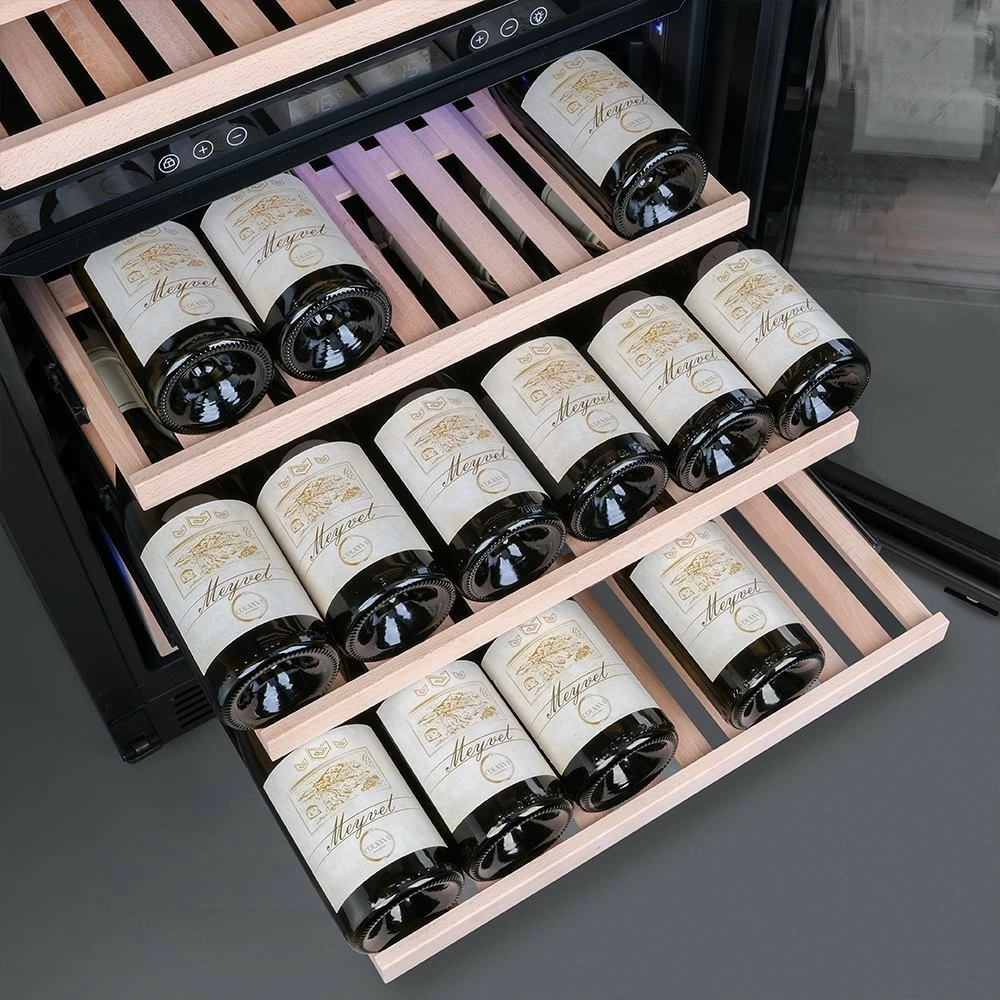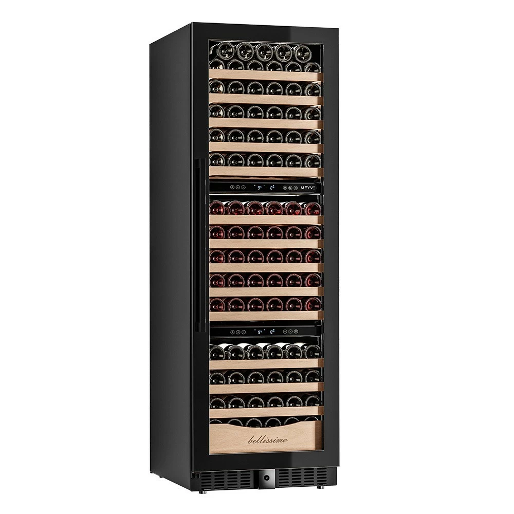 Винный шкаф Meyvel | Мэйвел MV154PRO-KBT3 — идеальное место хранения и демонстрации коллекции вин в ресторанах, барах или винных комнатах. Он вмещает внушительную винотеку до 154 бутылок типа «Бордо», а если размер бутылки нестандартный, то съемные полки решат эту проблему. Три независимые температурные зоны для разных сортов напитков: верхняя поддерживает температуру от +5 до +20°C, средняя — от +5 до +12°C, нижняя — от +12 до +20°C. Подсветка белого, синего или янтарного цвета создает правильную атмосферу для эффектной демонстрации содержимого. Модель MV154PRO-KBT3 может быть как отдельностоящей, так и встроенной в нишу, а перенавешиваемая дверь предоставляет возможность разместить ее в любом удобном месте. Стоит отметить низкий уровень шума — всего 41 дБ, поэтому холодильник для вина не потревожит владельца неприятными громкими звуками. Для вашего спокойствия Meyvel MV154PRO-KBT3 оснащен системой сигнализации, которая оповестит об отклонениях температуры, функцией блокировки панели управления, предотвращающей случайные изменения настроек, и замком. Угольный фильтр очищает воздух внутри шкафа от посторонних запахов. Надежный, функциональный и стильный винный шкаф Meyvel MV154PRO-KBT3 станет достойным украшением ресторана, бара, гостиницы или кухни опытного коллекционера.