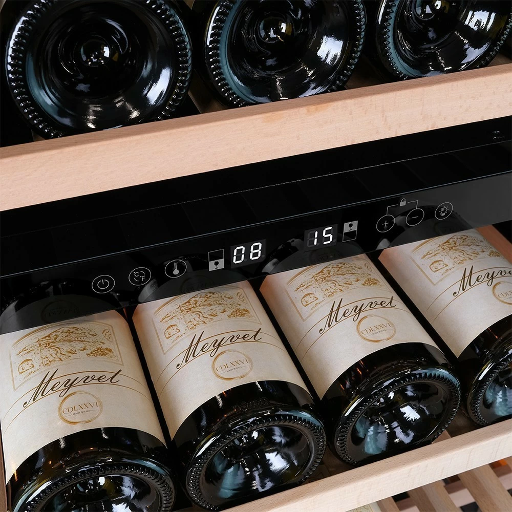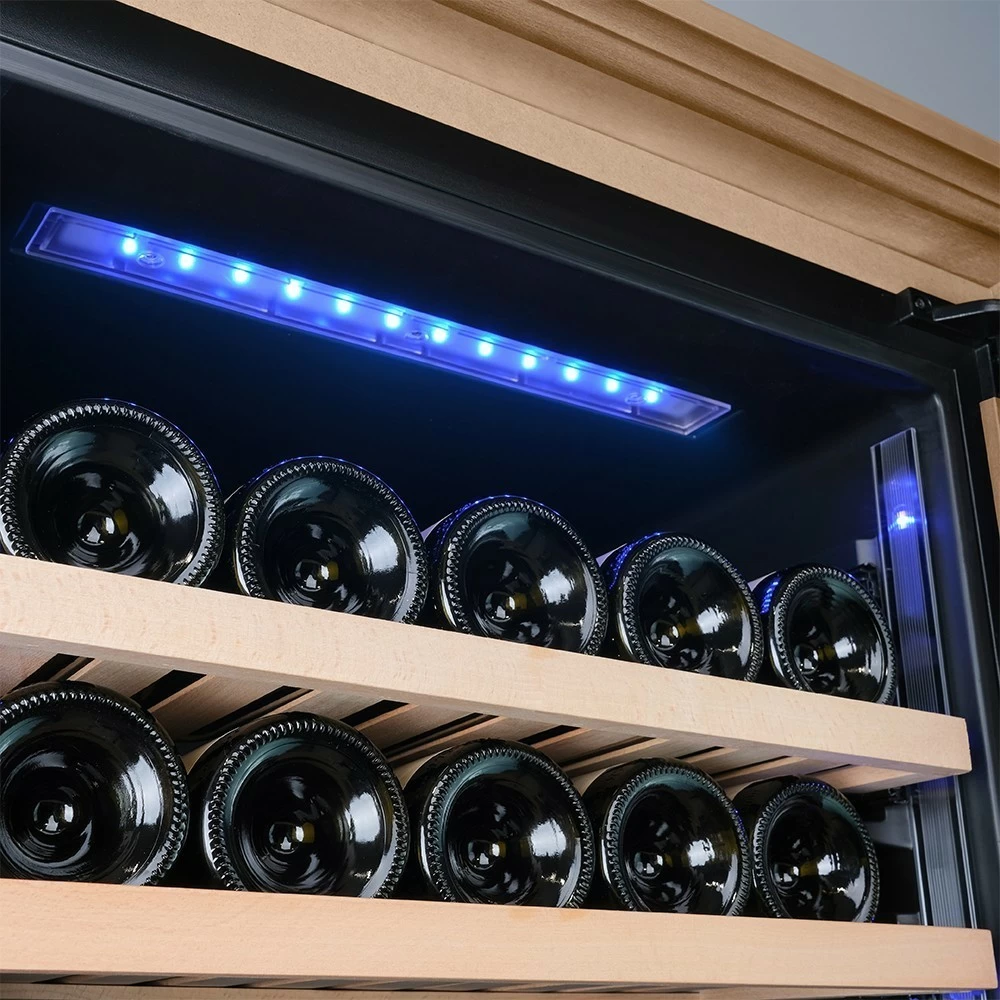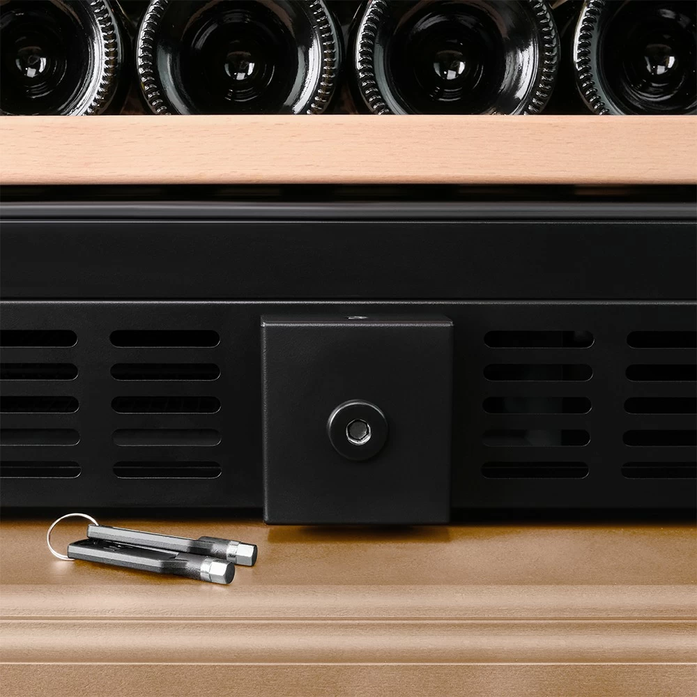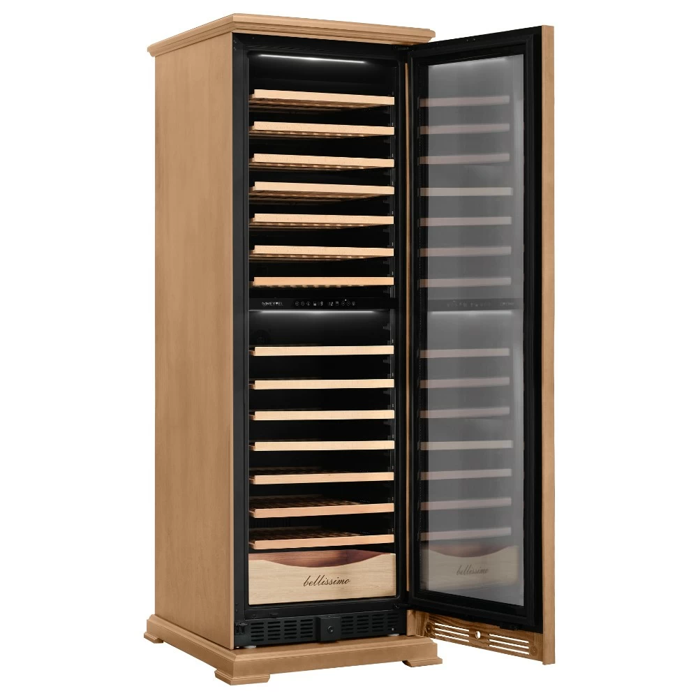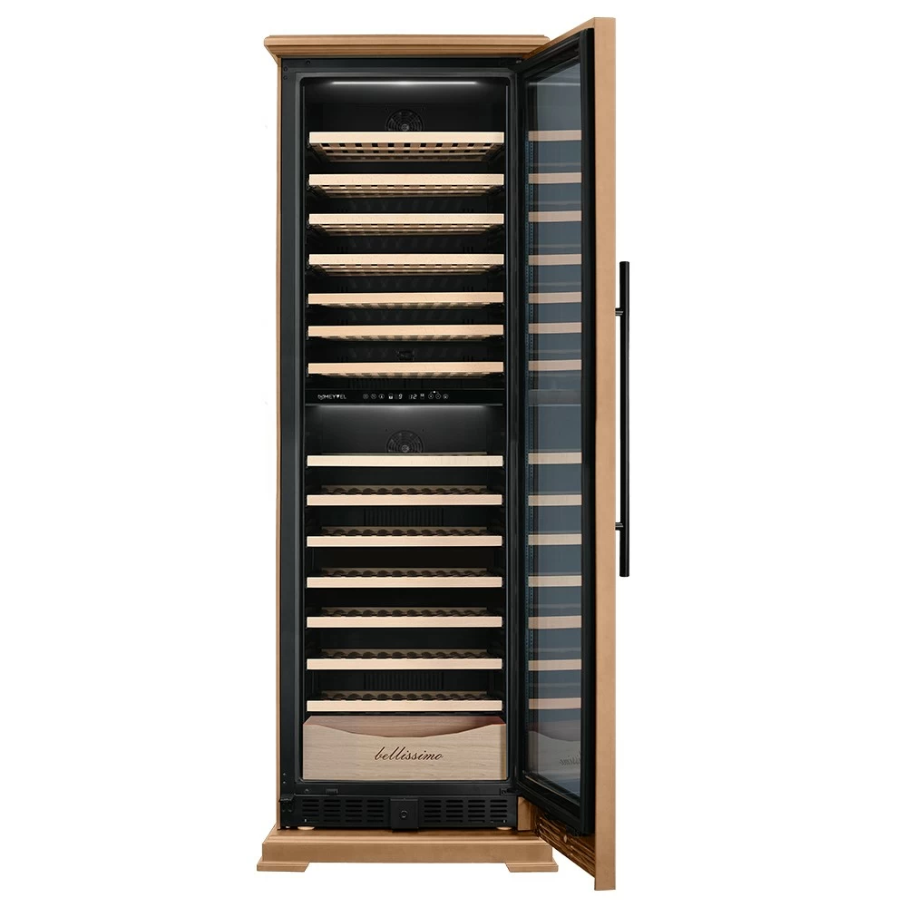 Винный шкаф Meyvel | Мэйвел MV163PRO-KBT2 – предназначен для профессионального и длительного хранения различных сортов вин. Он так же оснащен дверью с защитой от ультрафиолетовых лучей и поддерживает влажность в диапазоне 60-80%, как в настоящем винном погребе. Стальной корпус обшит натуральным деревом, который выдерживает большие нагрузки и обладает красивой текстурой. Стильный шкаф MV163PRO-KBT2 сочетает в себе неподвластное времени очарование, а так же качество натуральных материалов и высоких технологий. Внутреннее пространство винного шкафа разделено на две температурные зоны. Вы сможете настроить их так, что бы хранить все виды вина при идеальной температуре или установить разные значения, что бы напитки всегда были готовы к подаче. Так же в каждой зоне есть полка с увеличенным пространством. На таких полках Вы сможете разместить не только стандартные бутылки Бордо, но и Магнум. А если нужно разместить что-то побольше - то в этом случае можно вынуть одну или несколько полок. Внизу есть выдвижной ящик - в нем Вы можете хранить вино в бутылках или винные атрибуты (штопор, бокалы, аэраторы, декантеры, каплеуловители, термометры и т.д.). Идеальной температурой хранения вина считается температура +12°C. Подаются розовые и сухие белые вина обычно при температуре от +8°C до +14°C, игристые вина и шампанское при +6°C до +8°C, а легкие красные вина - при +13°C и насыщенные красные вина при +15°C - +19°C. Винный холодильник оснащён надёжным и экономичным компрессором. Есть ручка, вентиляционная решётка и замок. Полки выполнены из массива бука. Этот натуральный и крепкий материал не только имеет красивую текстуру, но и прекрасно гасит небольшую вибрацию. Так что Ваше вино будет храниться в абсолютном покое. Несомненно, Вас порадует наличие панорамного светодиодного освещения (подсвечивает каждую полку), которое имеет три цвета - белый, янтарный и синий. Оно не выделяет тепло и следовательно - не нагревает бутылки с вином. Так что Вы сможете эффектно демонстрировать Вашу винную коллекцию. Наличие угольного фильтра помогает устранять внутри шкафа посторонние запахи, которые могут повлиять на вкус вина. Менять его рекомендуется 1 раз в год. Дополнительно рекомендуем приобрести сразу 2-3 фильтра, чтобы при необходимости он всегда был под рукой. Так же, из важных функций в этой модели есть сигнализация открытой двери и отклонения температуры, автоматическая разморозка и зимний режим, который подогреет внутреннее пространство, если температура в помещении опустилась ниже заданной. Управление сенсорное с функцией блокировки. Есть режим «Эко-демо» и память настроек.