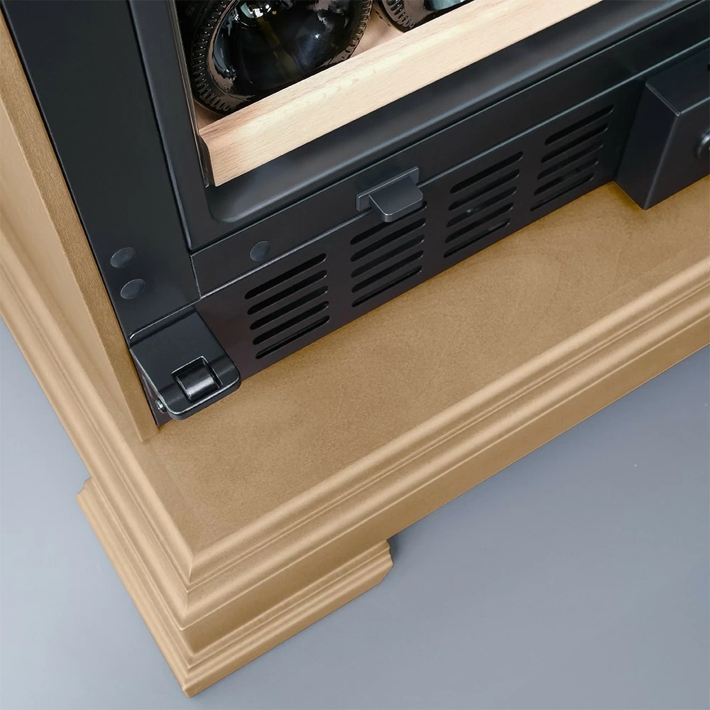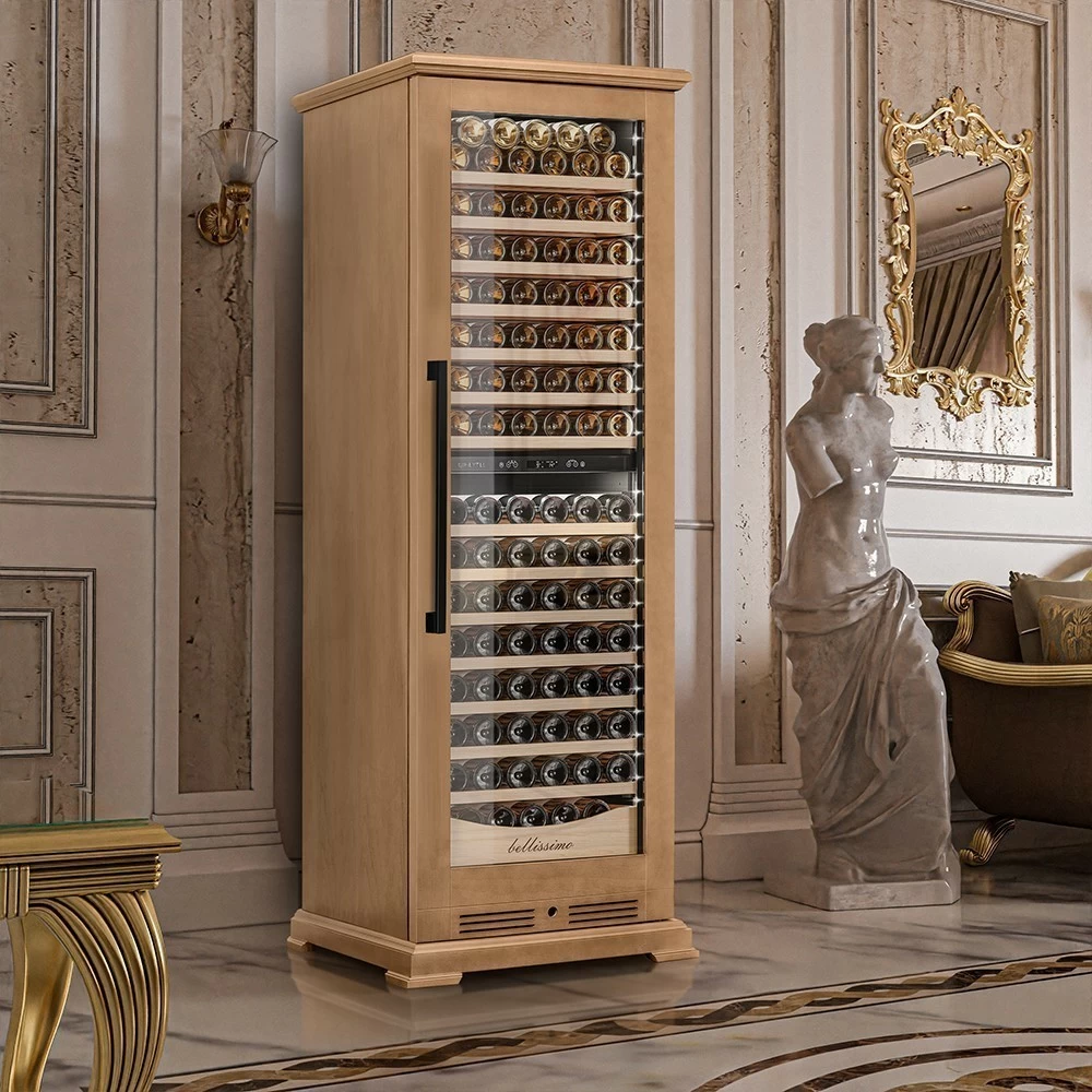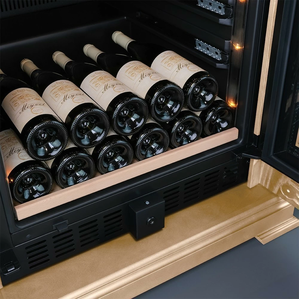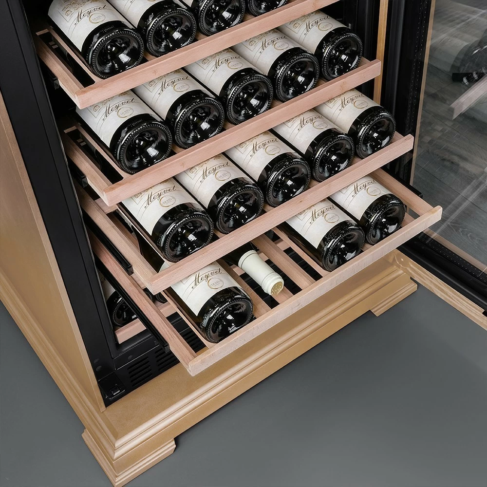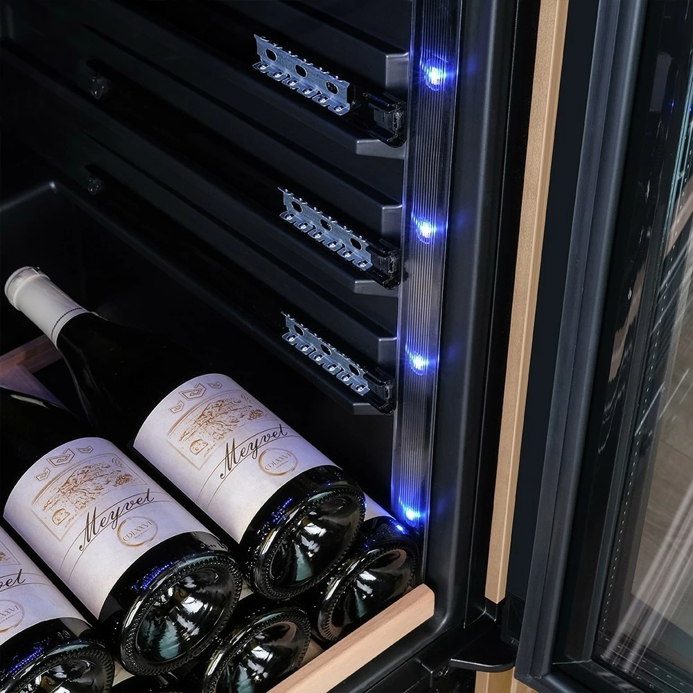 Винный шкаф Meyvel | Мэйвел MV163PRO-KBT2 – предназначен для профессионального и длительного хранения различных сортов вин. Он так же оснащен дверью с защитой от ультрафиолетовых лучей и поддерживает влажность в диапазоне 60-80%, как в настоящем винном погребе. Стальной корпус обшит натуральным деревом, который выдерживает большие нагрузки и обладает красивой текстурой. Стильный шкаф MV163PRO-KBT2 сочетает в себе неподвластное времени очарование, а так же качество натуральных материалов и высоких технологий. Внутреннее пространство винного шкафа разделено на две температурные зоны. Вы сможете настроить их так, что бы хранить все виды вина при идеальной температуре или установить разные значения, что бы напитки всегда были готовы к подаче. Так же в каждой зоне есть полка с увеличенным пространством. На таких полках Вы сможете разместить не только стандартные бутылки Бордо, но и Магнум. А если нужно разместить что-то побольше - то в этом случае можно вынуть одну или несколько полок. Внизу есть выдвижной ящик - в нем Вы можете хранить вино в бутылках или винные атрибуты (штопор, бокалы, аэраторы, декантеры, каплеуловители, термометры и т.д.). Идеальной температурой хранения вина считается температура +12°C. Подаются розовые и сухие белые вина обычно при температуре от +8°C до +14°C, игристые вина и шампанское при +6°C до +8°C, а легкие красные вина - при +13°C и насыщенные красные вина при +15°C - +19°C. Винный холодильник оснащён надёжным и экономичным компрессором. Есть ручка, вентиляционная решётка и замок. Полки выполнены из массива бука. Этот натуральный и крепкий материал не только имеет красивую текстуру, но и прекрасно гасит небольшую вибрацию. Так что Ваше вино будет храниться в абсолютном покое. Несомненно, Вас порадует наличие панорамного светодиодного освещения (подсвечивает каждую полку), которое имеет три цвета - белый, янтарный и синий. Оно не выделяет тепло и следовательно - не нагревает бутылки с вином. Так что Вы сможете эффектно демонстрировать Вашу винную коллекцию. Наличие угольного фильтра помогает устранять внутри шкафа посторонние запахи, которые могут повлиять на вкус вина. Менять его рекомендуется 1 раз в год. Дополнительно рекомендуем приобрести сразу 2-3 фильтра, чтобы при необходимости он всегда был под рукой. Так же, из важных функций в этой модели есть сигнализация открытой двери и отклонения температуры, автоматическая разморозка и зимний режим, который подогреет внутреннее пространство, если температура в помещении опустилась ниже заданной. Управление сенсорное с функцией блокировки. Есть режим «Эко-демо» и память настроек.