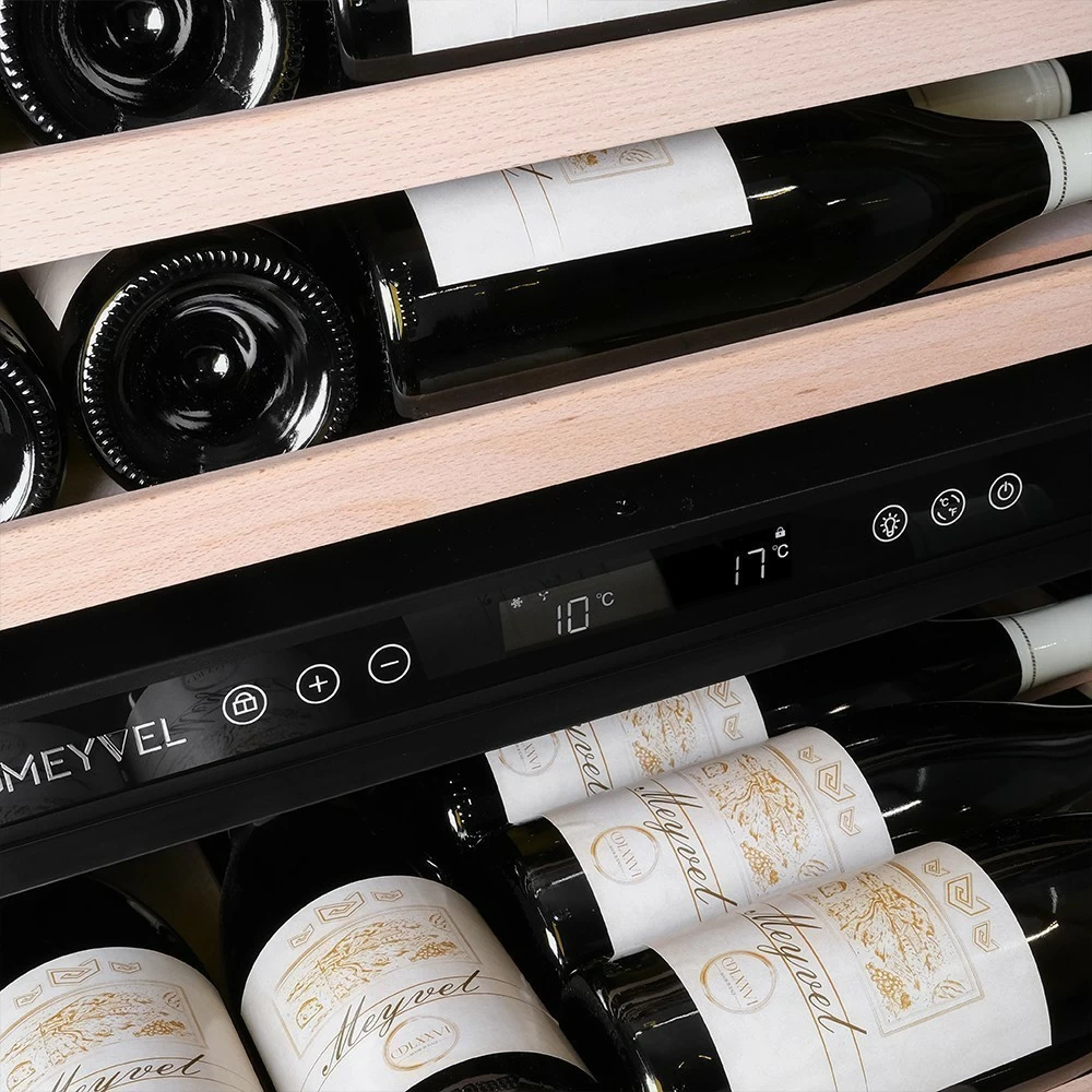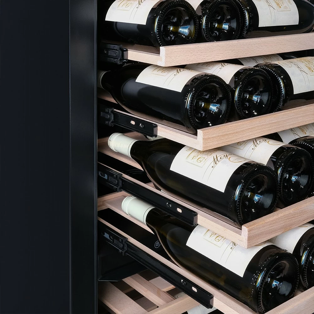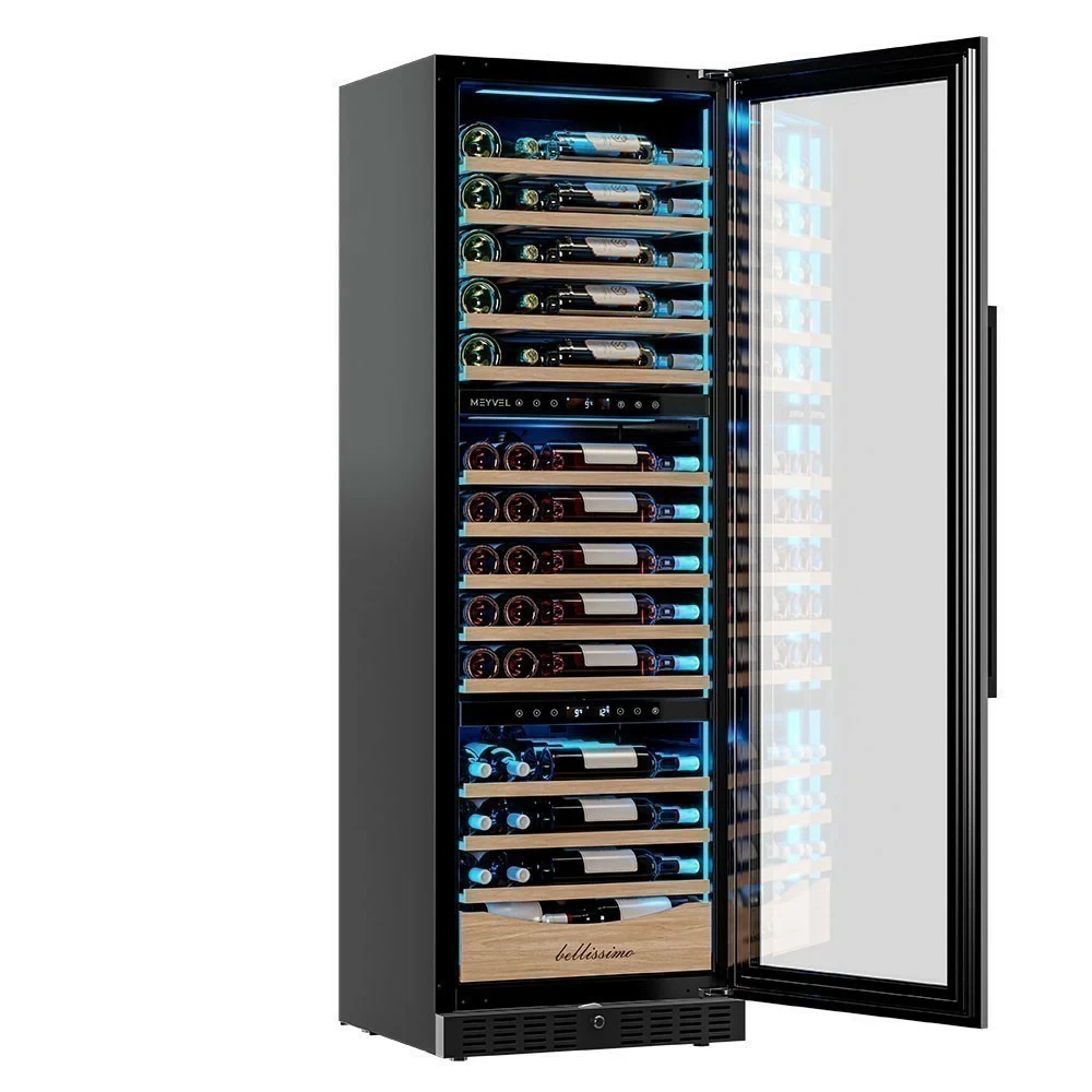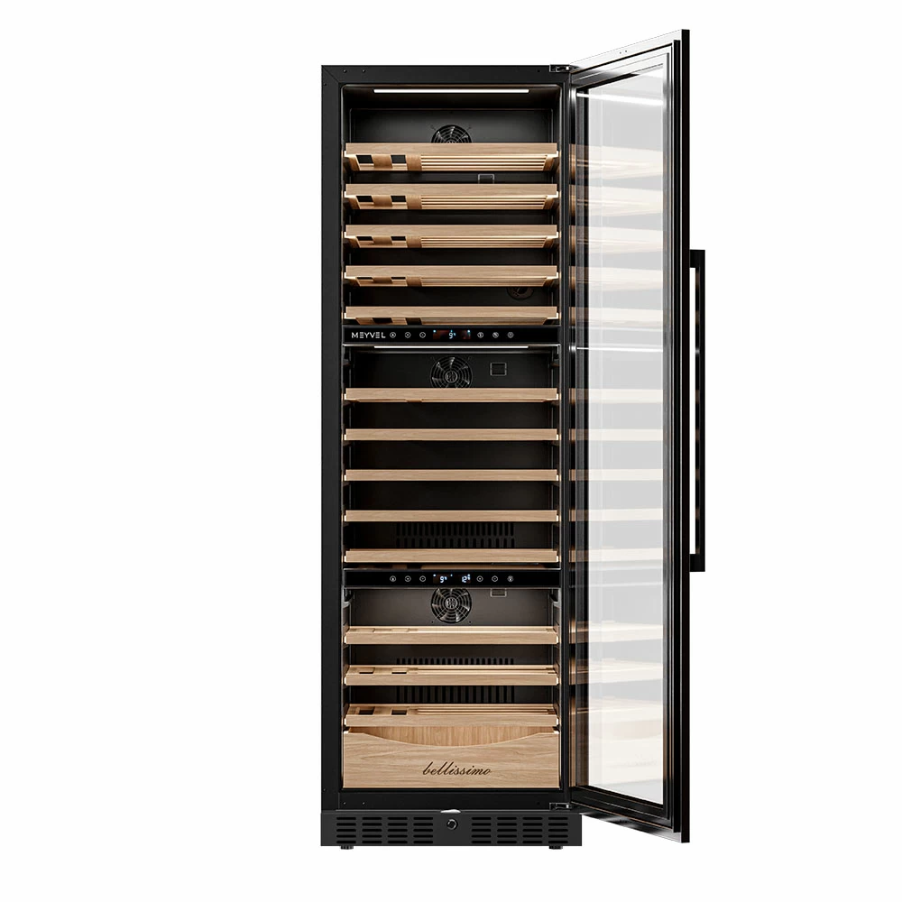 Винный шкаф Meyvel | Мэйвел MV98-KBT3 (Slim) — идеальное место хранения и демонстрации коллекции вин в ресторанах, барах или винных комнатах. Он вмещает внушительную винотеку до 98 бутылок типа «Бордо», а если размер бутылки нестандартный, то съемные полки решат эту проблему. Три независимые температурные зоны для разных сортов напитков: верхняя поддерживает температуру от +5 до +20°C, средняя — от +5 до +12°C, нижняя — от +12 до +20°C. Подсветка белого, синего или янтарного цвета создает правильную атмосферу для эффектной демонстрации содержимого. Модель MV98-KBT3 (Slim) может быть как отдельностоящей, так и встроенной в нишу, а перенавешиваемая дверь предоставляет возможность разместить ее в любом удобном месте. Стоит отметить низкий уровень шума — всего 41 дБ, поэтому холодильник для вина не потревожит владельца неприятными громкими звуками. Для вашего спокойствия Meyvel MV98-KBT3 (Slim) оснащен системой сигнализации, которая оповестит об отклонениях температуры, функцией блокировки панели управления, предотвращающей случайные изменения настроек. Угольный фильтр очищает воздух внутри шкафа от посторонних запахов. Надежный, функциональный и стильный винный шкаф Meyvel MV98-KBT3 (Slim) станет достойным украшением ресторана, бара, гостиницы или кухни опытного коллекционера.