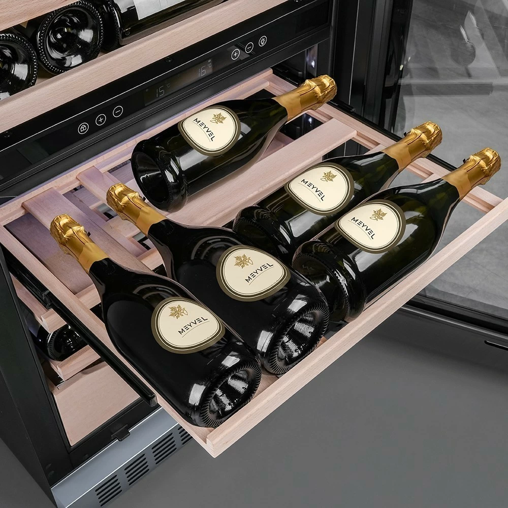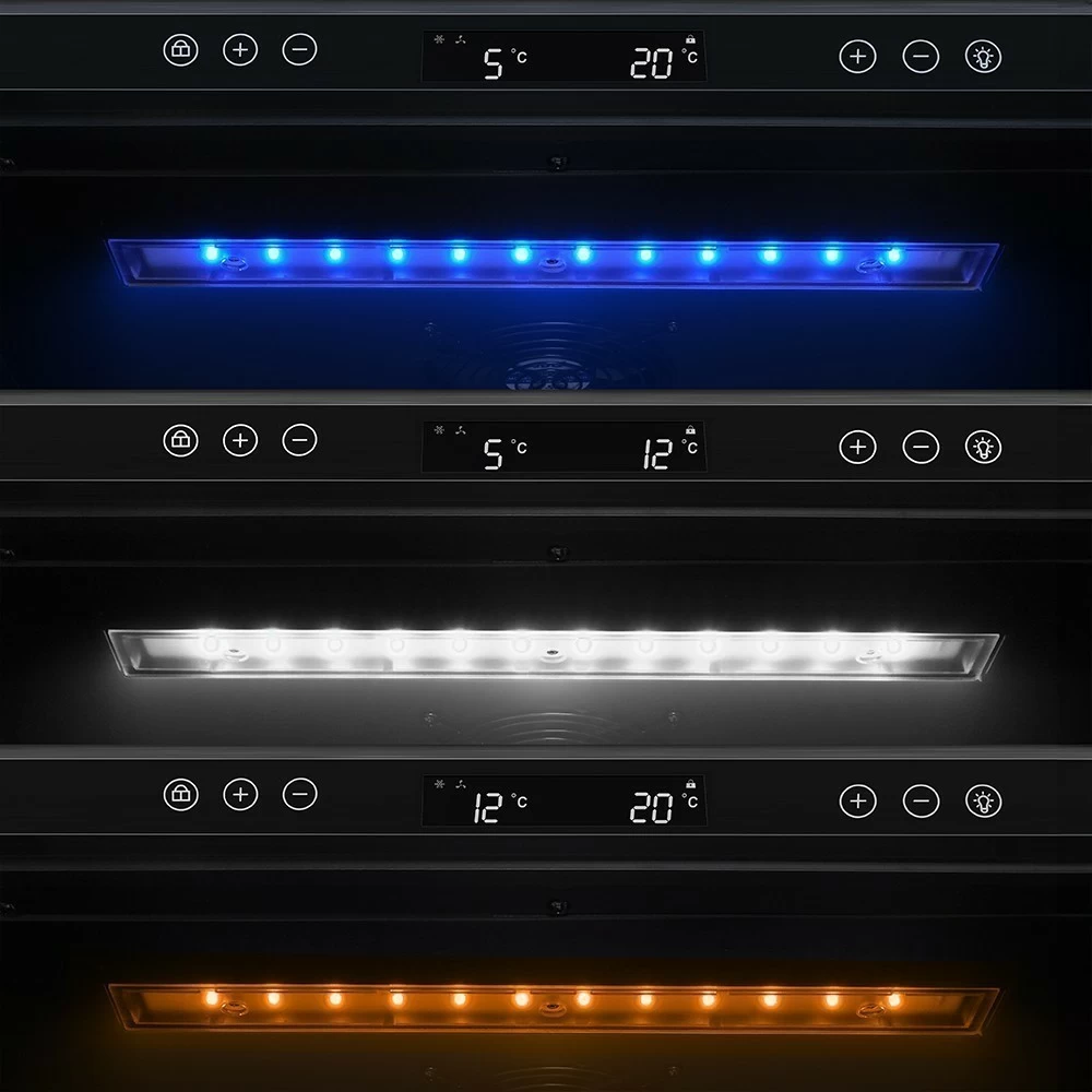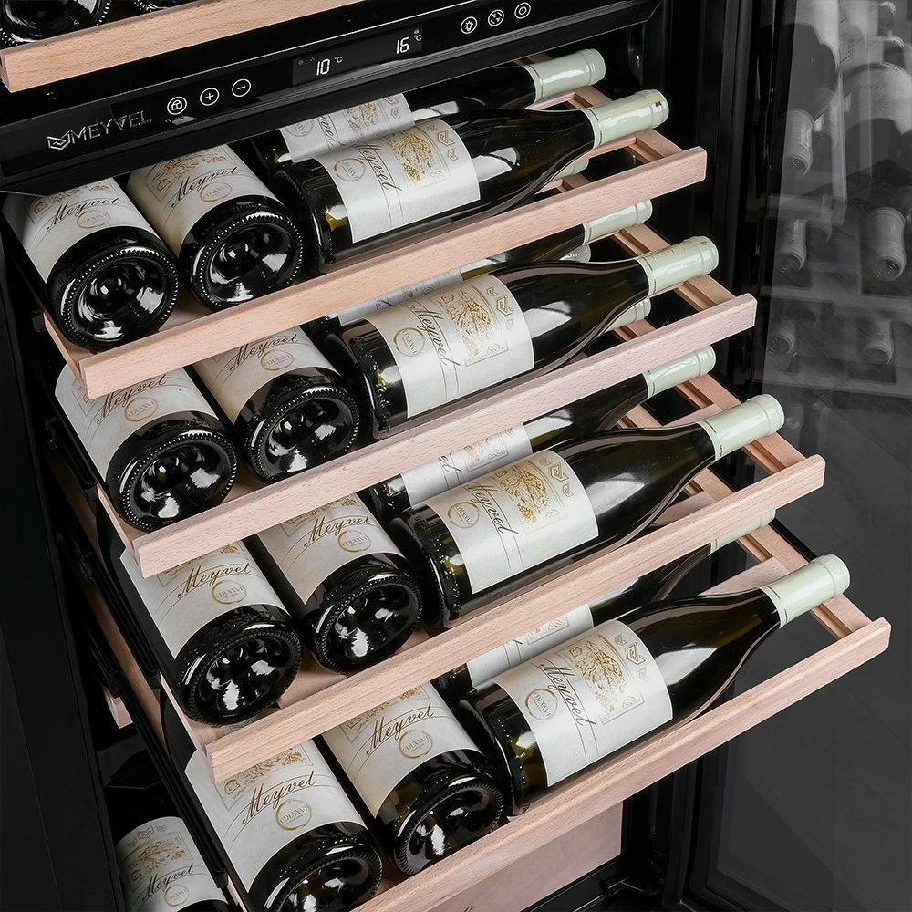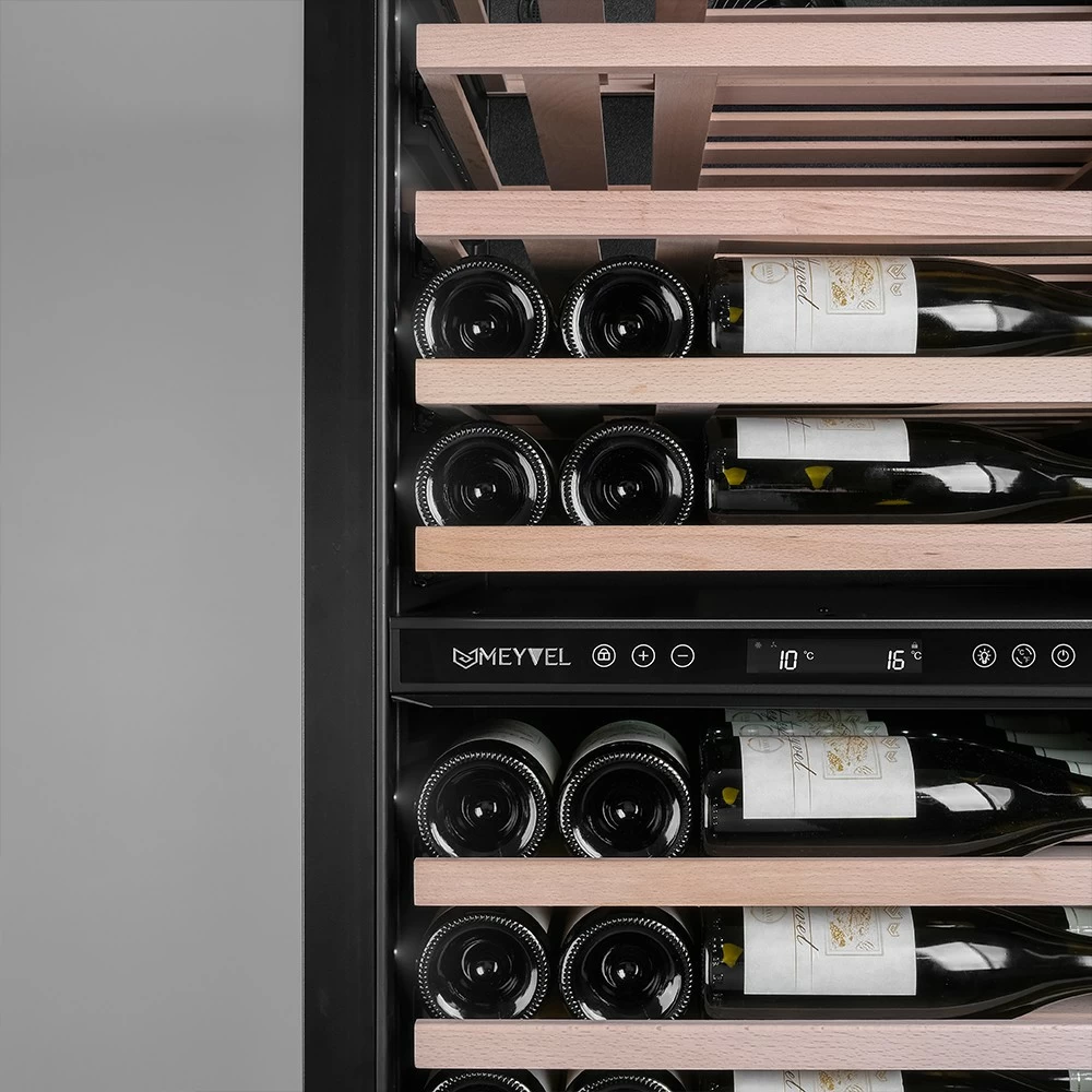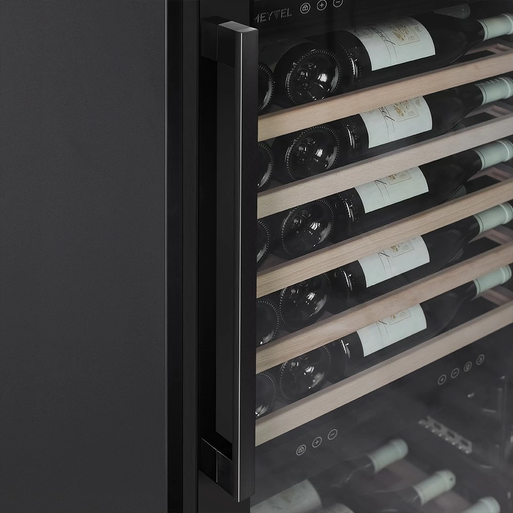 Винный шкаф Meyvel | Мэйвел MV98-KBT3 (Slim) — идеальное место хранения и демонстрации коллекции вин в ресторанах, барах или винных комнатах. Он вмещает внушительную винотеку до 98 бутылок типа «Бордо», а если размер бутылки нестандартный, то съемные полки решат эту проблему. Три независимые температурные зоны для разных сортов напитков: верхняя поддерживает температуру от +5 до +20°C, средняя — от +5 до +12°C, нижняя — от +12 до +20°C. Подсветка белого, синего или янтарного цвета создает правильную атмосферу для эффектной демонстрации содержимого. Модель MV98-KBT3 (Slim) может быть как отдельностоящей, так и встроенной в нишу, а перенавешиваемая дверь предоставляет возможность разместить ее в любом удобном месте. Стоит отметить низкий уровень шума — всего 41 дБ, поэтому холодильник для вина не потревожит владельца неприятными громкими звуками. Для вашего спокойствия Meyvel MV98-KBT3 (Slim) оснащен системой сигнализации, которая оповестит об отклонениях температуры, функцией блокировки панели управления, предотвращающей случайные изменения настроек. Угольный фильтр очищает воздух внутри шкафа от посторонних запахов. Надежный, функциональный и стильный винный шкаф Meyvel MV98-KBT3 (Slim) станет достойным украшением ресторана, бара, гостиницы или кухни опытного коллекционера.