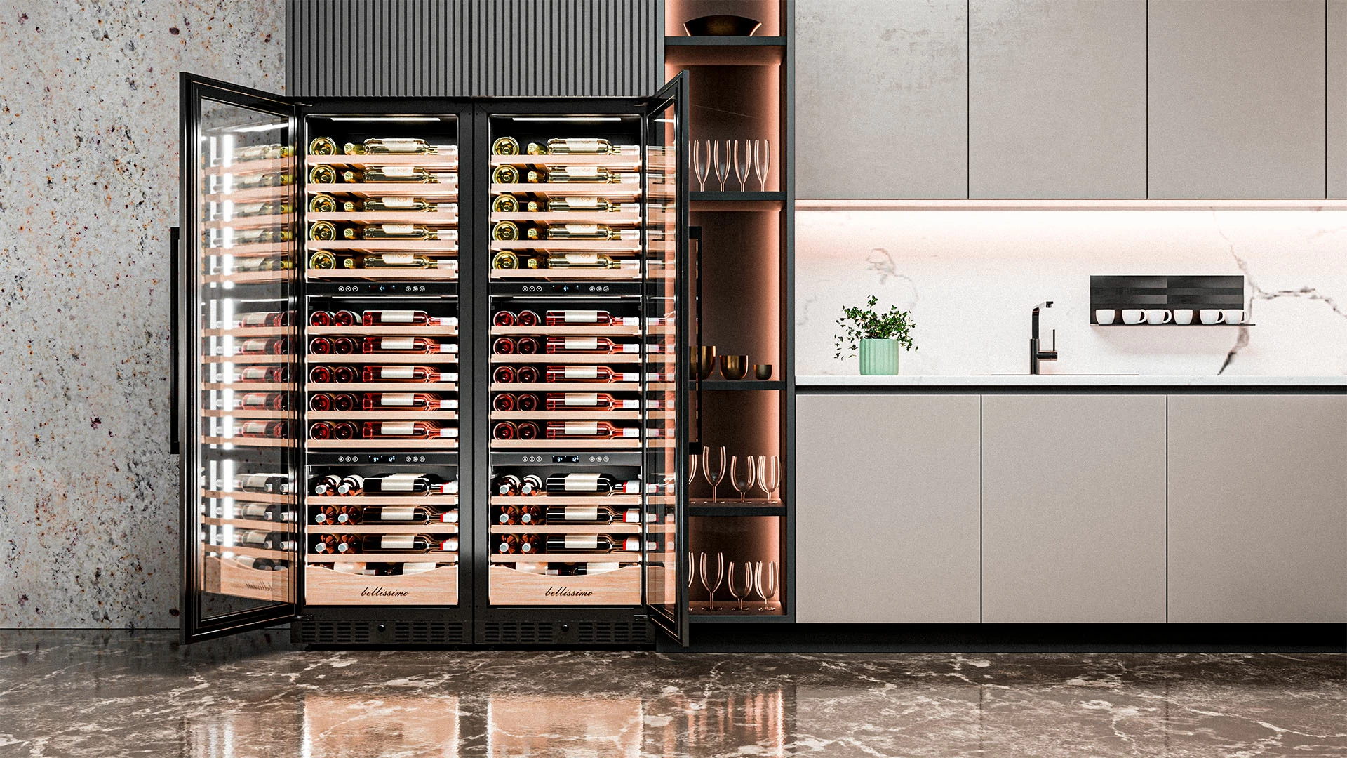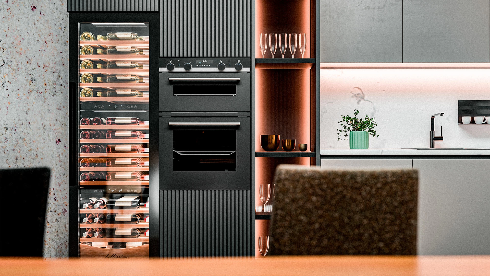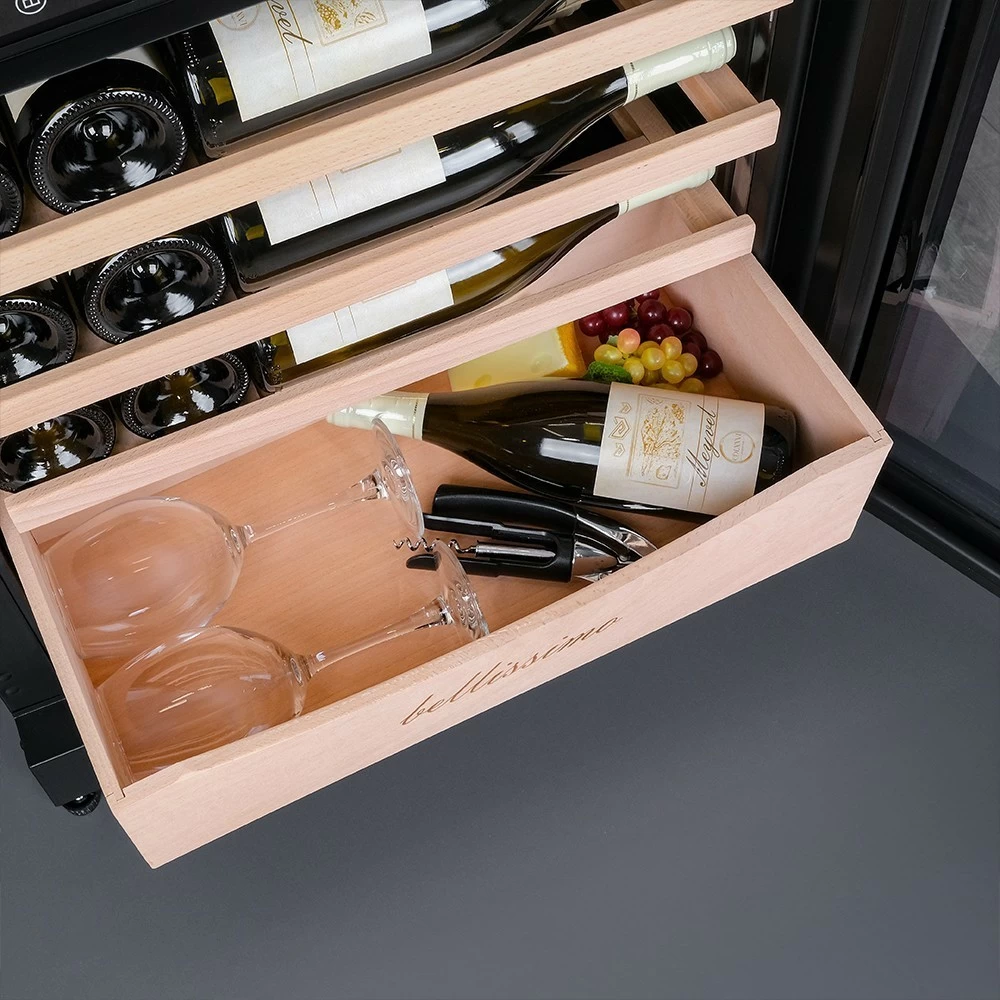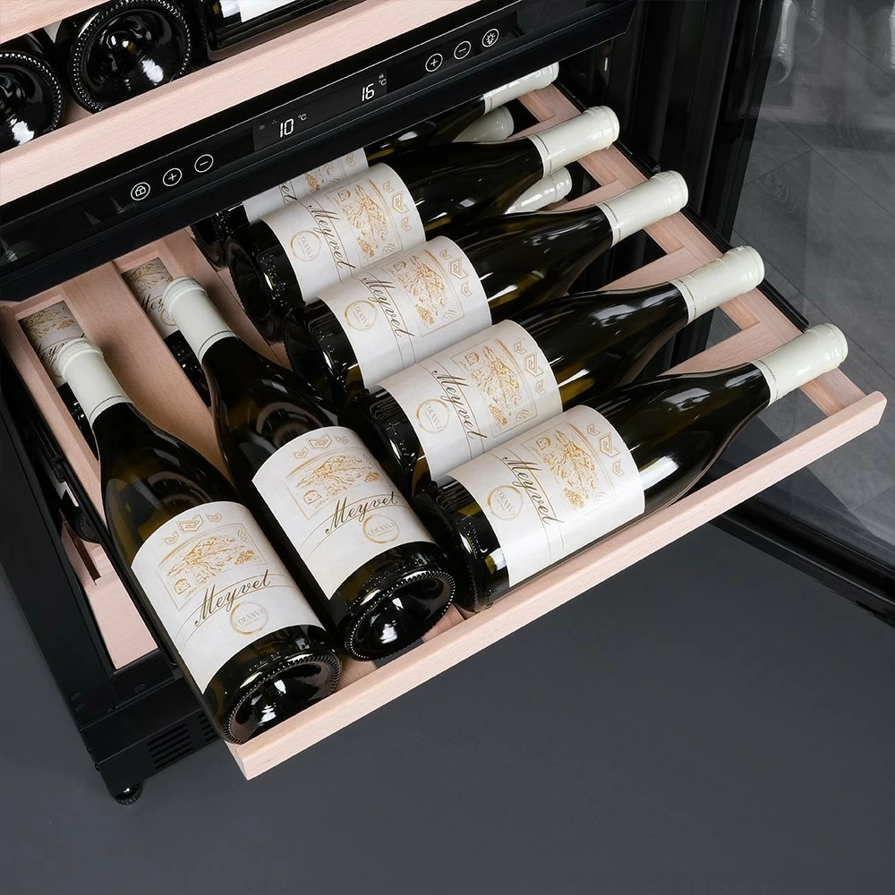 Винный шкаф Meyvel | Мэйвел MV98-KBT3 (Slim) — идеальное место хранения и демонстрации коллекции вин в ресторанах, барах или винных комнатах. Он вмещает внушительную винотеку до 98 бутылок типа «Бордо», а если размер бутылки нестандартный, то съемные полки решат эту проблему. Три независимые температурные зоны для разных сортов напитков: верхняя поддерживает температуру от +5 до +20°C, средняя — от +5 до +12°C, нижняя — от +12 до +20°C. Подсветка белого, синего или янтарного цвета создает правильную атмосферу для эффектной демонстрации содержимого. Модель MV98-KBT3 (Slim) может быть как отдельностоящей, так и встроенной в нишу, а перенавешиваемая дверь предоставляет возможность разместить ее в любом удобном месте. Стоит отметить низкий уровень шума — всего 41 дБ, поэтому холодильник для вина не потревожит владельца неприятными громкими звуками. Для вашего спокойствия Meyvel MV98-KBT3 (Slim) оснащен системой сигнализации, которая оповестит об отклонениях температуры, функцией блокировки панели управления, предотвращающей случайные изменения настроек. Угольный фильтр очищает воздух внутри шкафа от посторонних запахов. Надежный, функциональный и стильный винный шкаф Meyvel MV98-KBT3 (Slim) станет достойным украшением ресторана, бара, гостиницы или кухни опытного коллекционера.